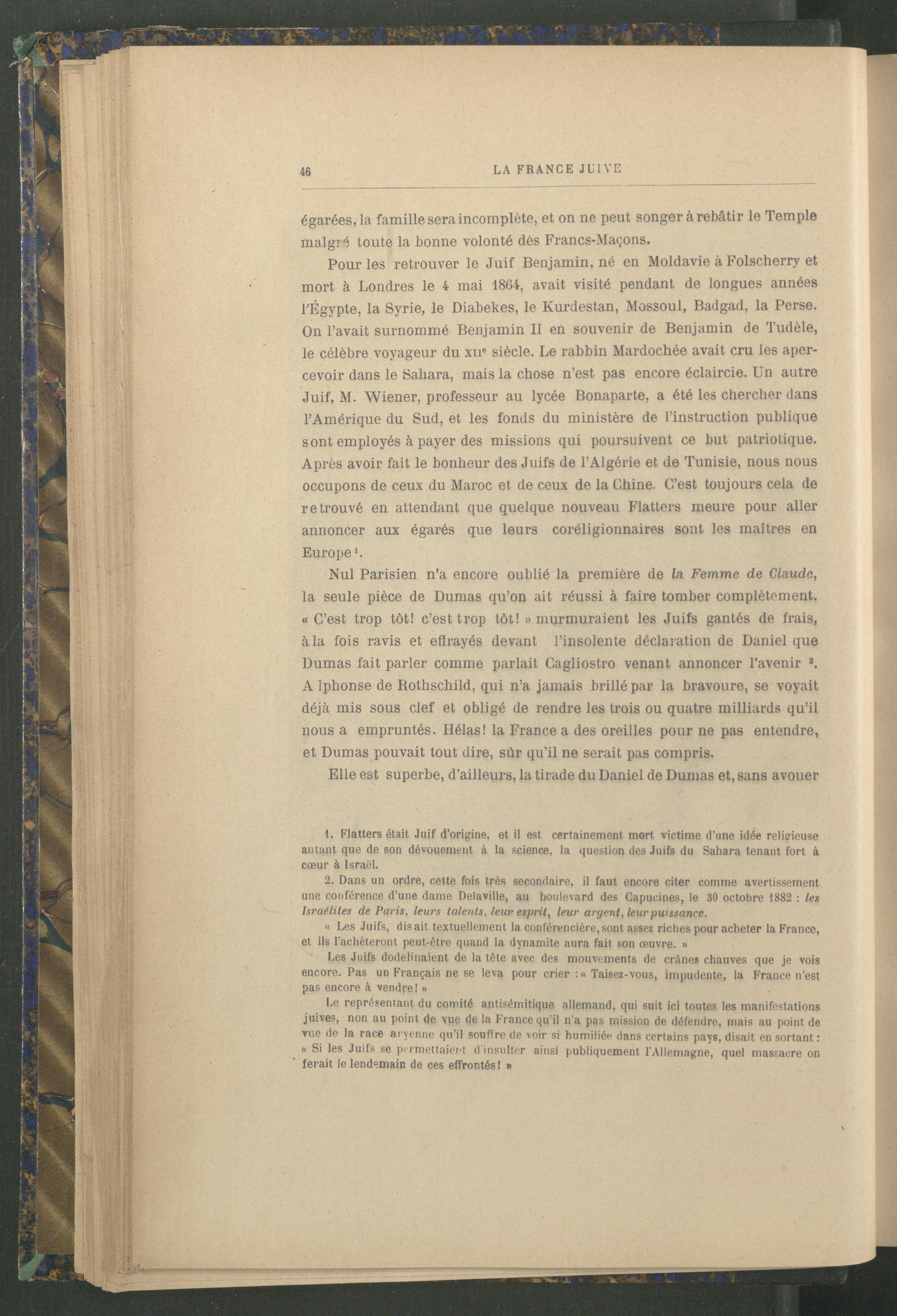 Nul Parisien n’a encore oublié la première de la Femme de Claude, la seule pièce de Dumas qu’on ait réussi à faire tomber complètement. « C’est trop tôt! c’est trop tôt! «murmuraient les Juifs gantés de frais, à la fois ravis et effrayés devant l’insolente déclaration de Daniel que Dumas fait parler comme parlait Cagliostro venant annoncer l’avenir a . A lphonse de Rothschild , qui n’a jamais brillé par la bravoure, se voyait déjà mis sous clef et obligé de rendre les trois ou quatre milliards qu’il nous a empruntés. Hélas ! la France a des oreilles pour ne pas entendre, et Dumas pouvait tout dire, sûr qu’il ne serait pas compris.