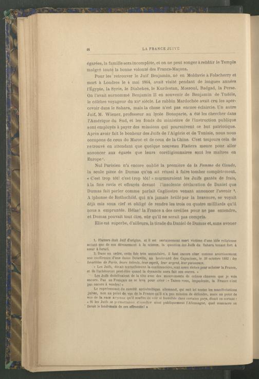 Pour les retrouver le Juif Benjamin , né en Moldavie à Folscherry et mort à Londres le 4 mai 1864, avait visité pendant de longues années FÉgypte, la Syrie , le Diabekes, le Kurdestan, Mossoul , Badgad, la Perse. On l’avait surnommé Benjamin II en souvenir de Benjamin de Tudèle , le célèbre voyageur du xu e siècle. Le rabbin Mardochée avait cru les apercevoir dans le Sahara , mais la chose n’est pas encore éclaircie. Un autre Juif, M. Wiener, professeur au lycée Bonaparte, a été les chercher dans l’Amérique du Sud , et les fonds du ministère de l’instruction publique sont employés à payer des missions qui poursuivent ce but patriotique. Après avoir fait le bonheur des Juifs de l’Algérie et de Tunisie , nous nous occupons de ceux du Maroc et de ceux de la Chine . C’est toujours cela de retrouvé en attendant que quelque nouveau Flatters meure pour aller annoncer aux égarés que leurs coréligionnaires sont les maîtres en Europe 1 2 .