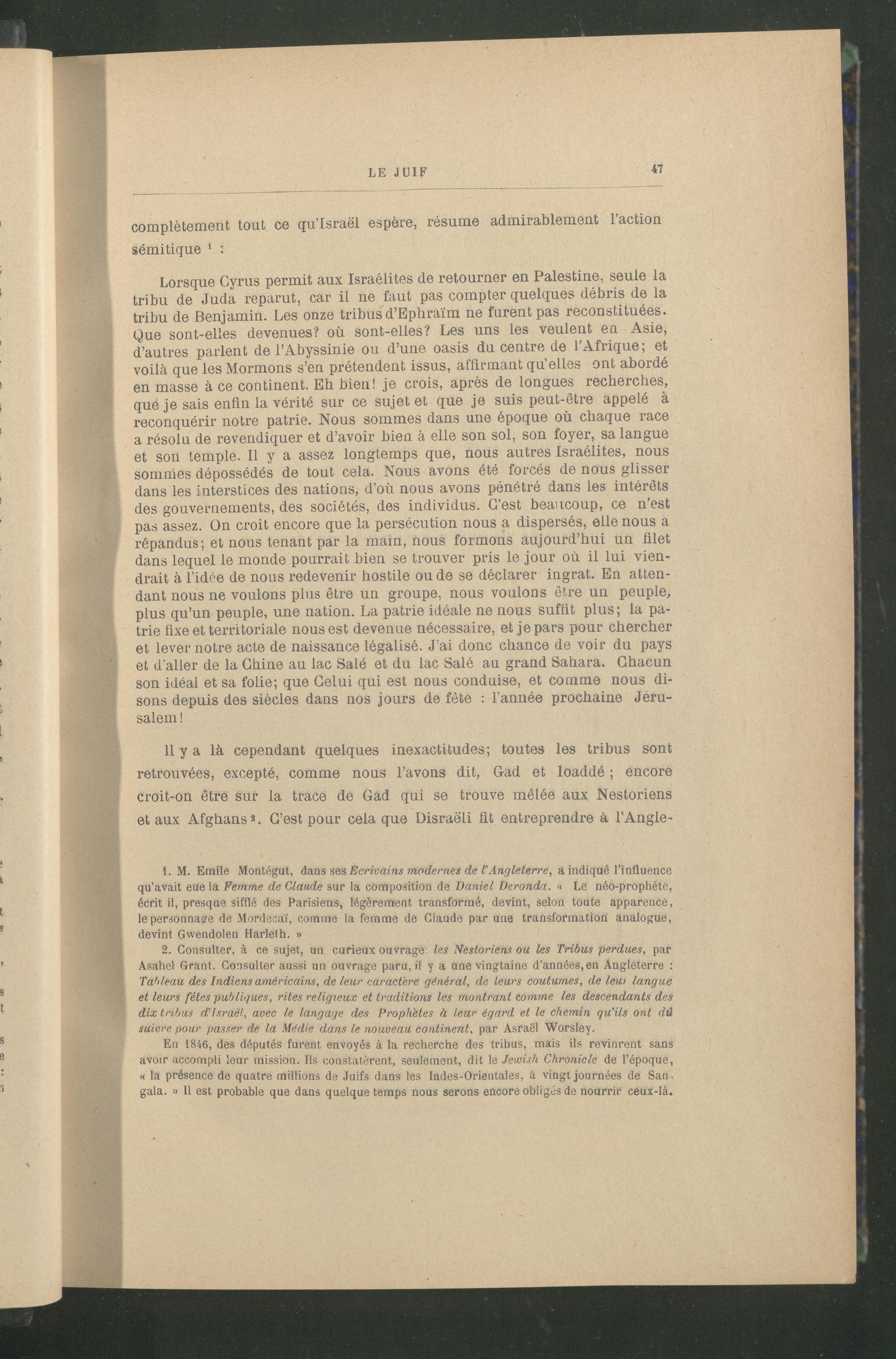 Lorsque Gyrus permit aux Israélites de retourner en Palestine, seule la tribu de Juda reparut, car il ne faut pas compter quelques débris de la tribu de Benjamin . Les onze tribus d’Bpbraïm ne furent pas reconstituées. Que sont-elles devenues? où sont-elles? Les uns les veulent en Asie , d’autres parlent de l’Abyssinie ou d’une oasis du centre de l’Afrique ; et voilà que les Mormons s’en prétendent issus, affirmant qu’elles ont abordé en masse à ce continent. Eh bien! je crois, après de longues recherches, qué je sais enfin la vérité sur ce sujet et que je suis peut-être appelé à reconquérir notre patrie. Nous sommes dans une époque où chaque race a résolu de revendiquer et d’avoir bien à elle son sol, son foyer, sa langue et son temple. Il y a assez longtemps que, nous autres Israélites , nous sommes dépossédés de tout cela. Nous avons été forcés de nous glisser dans les interstices des nations, d’où nous avons pénétré dans les intérêts des gouvernements, des sociétés, des individus. C’est beaucoup, ce n’est pas assez. On croit encore que la persécution nous a dispersés, elle nous a répandus; et nous tenant par la main, nous formons aujourd’hui un filet dans lequel le monde pourrait bien se trouver pris le jour où il lui viendrait à l’idée de nous redevenir hostile ou de se déclarer ingrat. En attendant nous ne voulons plus être un groupe, nous voulons être un peuple, plus qu’un peuple, une nation. La patrie idéale ne nous suffit plus; la patrie fixe et territoriale nous est devenue nécessaire, et je pars pour chercher et lever notre acte de naissance légalisé. J’ai donc chance de voir du pays et d'aller de la Chine au lac Salé et du lac Salé au grand Sahara . Chacun son idéal et sa folie; que Celui qui est nous conduise, et comme nous disons depuis des siècles dans nos jours de fête : l’année prochaine Jéru salem !