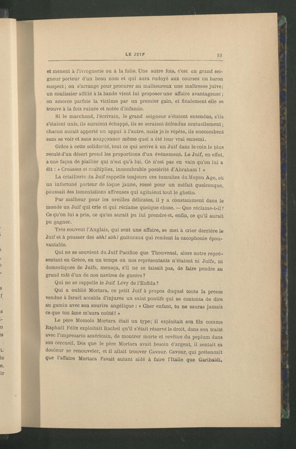 Le père Momolo Mortara était un type; il exploitait son fils comme Raphaël Félix exploitait Rachel qu’il s’était réservé le droit, dans son traité avec l’imprésario américain, de montrer morte et revêtue du péplum dans son cercueil. Dès que le père Mortara avait besoin d’argent, il sentait sa douleur se renouveler, et il allait trouver Gavour. Gavour, qui prétendait que l’affaire Mortara l’avait autant aidé à faire l’Italie que Garibaldi,