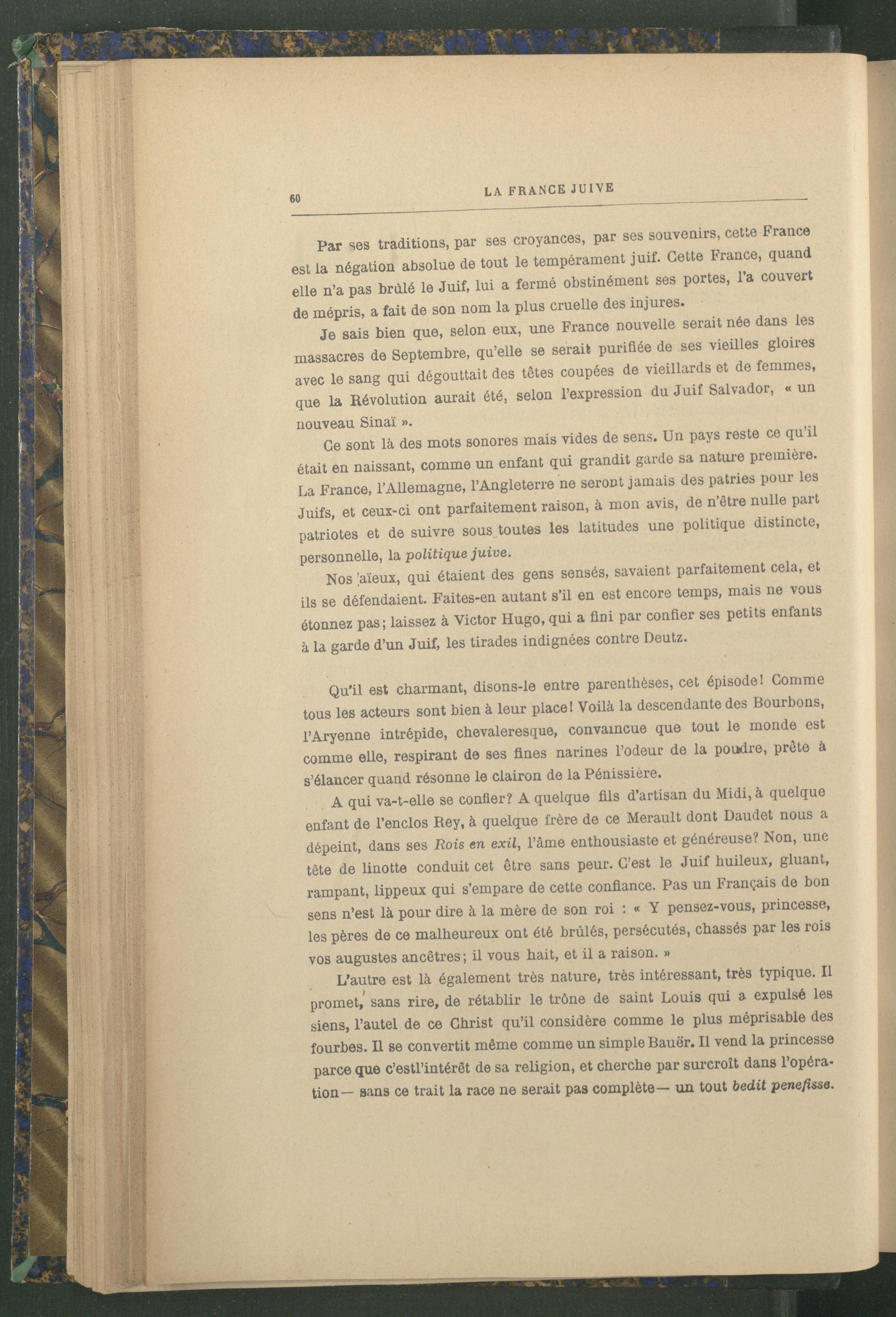Par ses traditions, par ses croyances, par ses souvenirs, cette France est la négation absolue de tout le tempérament juif . Cette France , quand elle n’a pas bràlé le Juif, lui a fermé obstinément ses portes, l’a couvert de mépris, a fait de son nom la plus cruelle des injures.