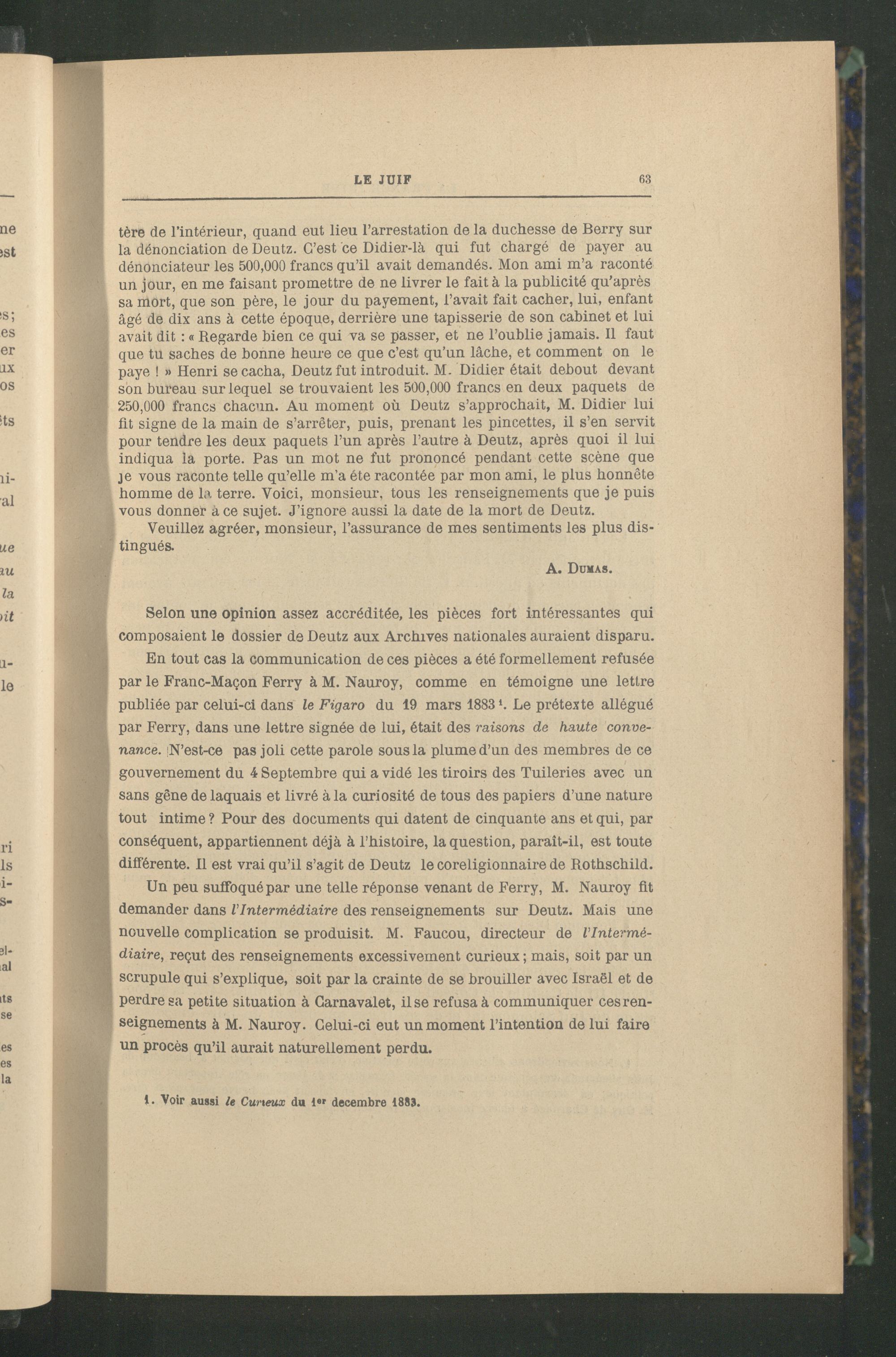 Un peu suffoqué par une telle réponse venant de Ferry , M. Nauroy fit demander dans l’Intermédiaire des renseignements sur Deutz. Mais une nouvelle complication se produisit. M. Faucou, directeur de l’Intermédiaire, reçut des renseignements excessivement curieux ; mais, soit par un scrupule qui s’explique, soit par la crainte de se brouiller avec Israël et de perdre sa petite situation à Carnavalet , il se refusa à communiquer ces renseignements à M. Nauroy. Celui-ci eut un moment l’intention de lui faire un procès qu’il aurait naturellement perdu.