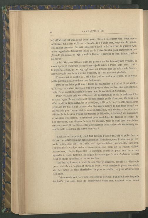 le Juif Michel est guillotiné pour avoir livré à la Russie des documents militaires. Un autre Goldsmith dérobe, il y a trois ans, les plans du grand État-major prussien. On sait le rôle qu’a joué la Païva avant la guerre. Qui ne se rappelle les tentatives faites par la Juive Kaulla pour surprendre nos plans de mobilisation? Qui a oublié Esther Guimont et son fameux salon politique?