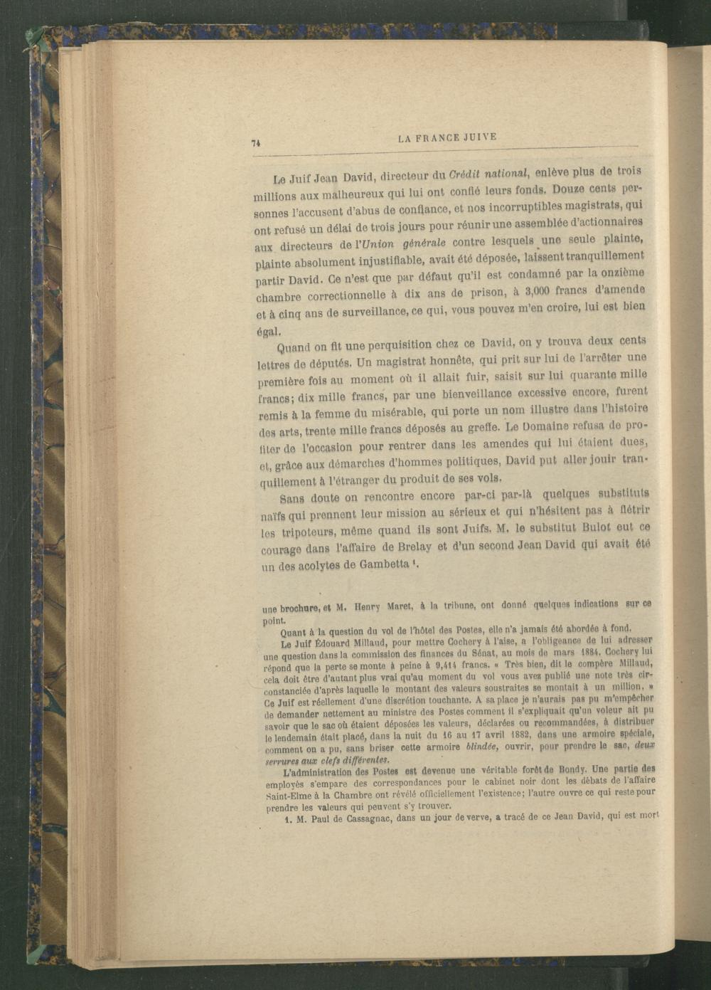 Sans doute on rencontre encore par-ci par-là quelques substituts naïfs qui prennent leur mission au sérieux et qui n’hésitent pas à flétrir les tripoteurs, même quand ils sont Juifs. M. le substitut Bulot eut ce courage dans l'affaire de Brelay et d’un second Jean David qui avait été un des acolytes de Gambetta *.