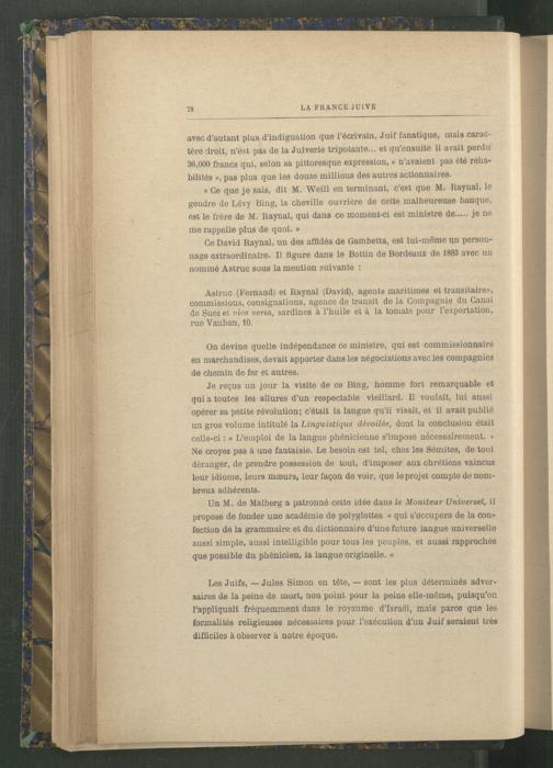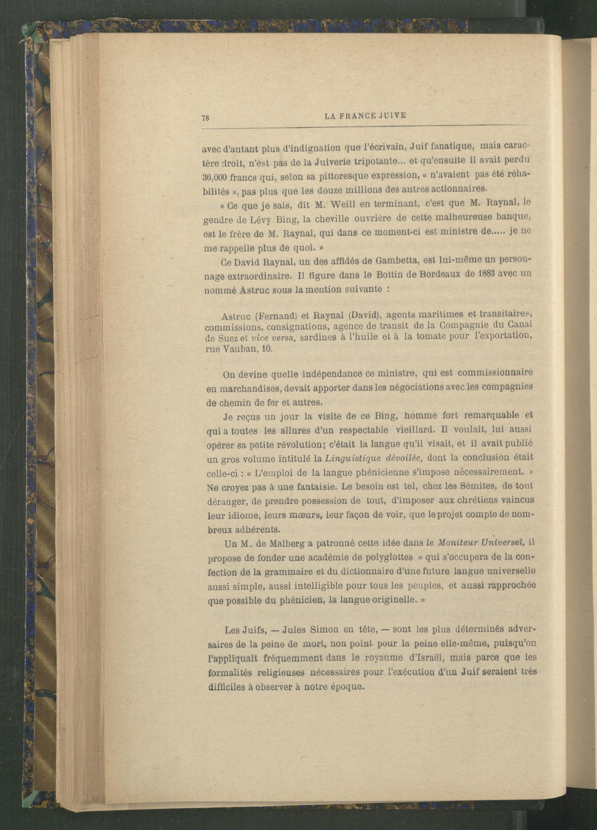 Je reçus un jour la visite de ce Bing, homme fort remarquable et qui a toutes les allures d’un respectable vieillard. Il voulait, lui aussi opérer sa petite révolution; c’était la langue qu’il visait, et il avait publié un gros volume intitulé la Linguistique dévoilée, dont la conclusion était celle-ci : « L’emploi de la langue phénicienne s’impose nécessairement. » Ne croyez pas à une fantaisie. Le besoin est tel, chez les Sémites, de tout déranger, de prendre possession de tout, d’imposer aux chrétiens vaincus leur idiome, leurs mœurs, leur façon de voir, que le projet compte de nombreux adhérents.