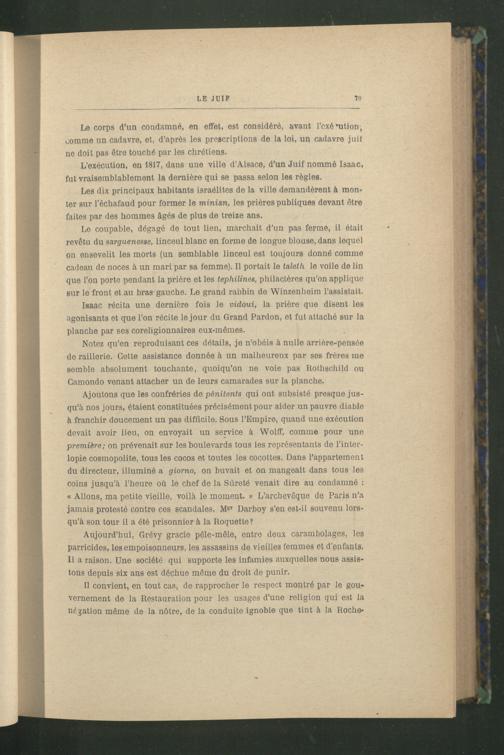 L’exécution, en 1817, dans une ville d’Alsace , d’un Juif nommé Isaac, fut vraisemblablement la dernière qui se passa selon les règles.