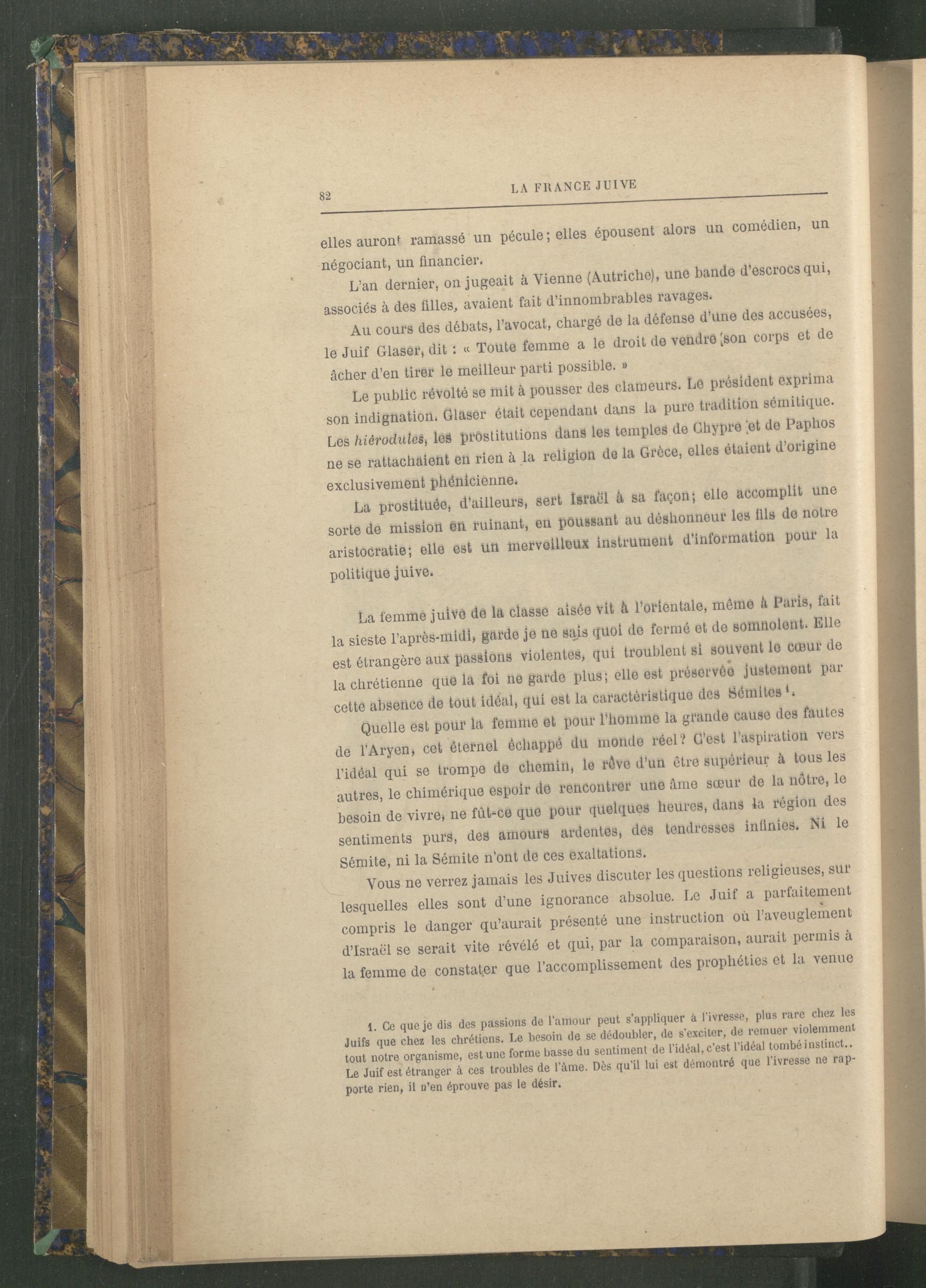 Au cours des débats, l’avocat, chargé de la défense d’une des accusées, le Juif Glaser , dit : « Toute femme a le droit de vendre [son corps et de âcher d’en tirer le meilleur parti possible. »