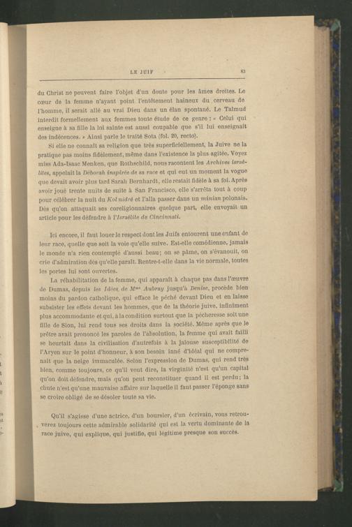 du Christ ne peuvent faire l’objet d’un doute pour les âmes droites. Le cœur de la femme n’ayant point l’entêtement haineux du cerveau de l’homme, il serait allé au vrai Dieu dans un élan spontané. Le Talmud interdit formellement aux femmes toute étude de ce genre : « Celui gui enseigne à sa tille la loi sainte est aussi coupable que s’il lui enseignait des indécences. » Ainsi parle le traité Sota (fol. 20, recto).