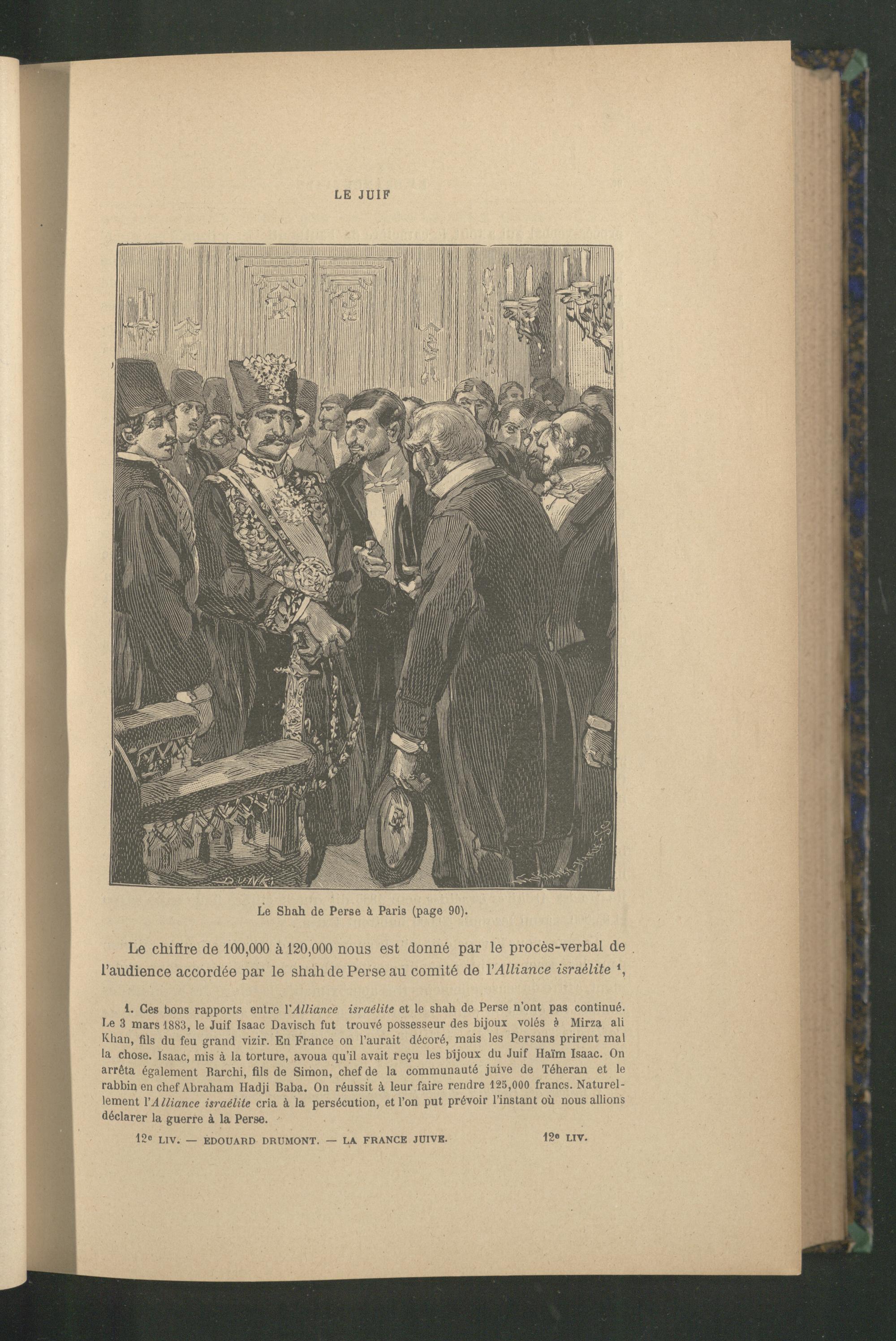 1. Ces bons rapports entre Y Alliance israélite et le shah de Perse n’ont pas continué, be 3 mars 1883, le Juif Isaac Davisch fut trouvé possesseur des bijoux volés à Mirza ali Khan, fils du feu grand vizir. En France on l’aurait décoré, mais les Persans prirent mal la chose. Isaac, mis à la torture, avoua qu'il avait reçu les bijoux du Juif Haïm Isaac. On arrêta également Barchi, fils de Simon, chef de la communauté juive de Téhéran et le rabbin en chef Abraham Hadji Baba. On réussit à leur faire rendre 125,000 francs. Naturellement VAlliance israélite cria à la persécution, et l’on put prévoir l’instant où nous allions déclarer la guerre à la Perse.