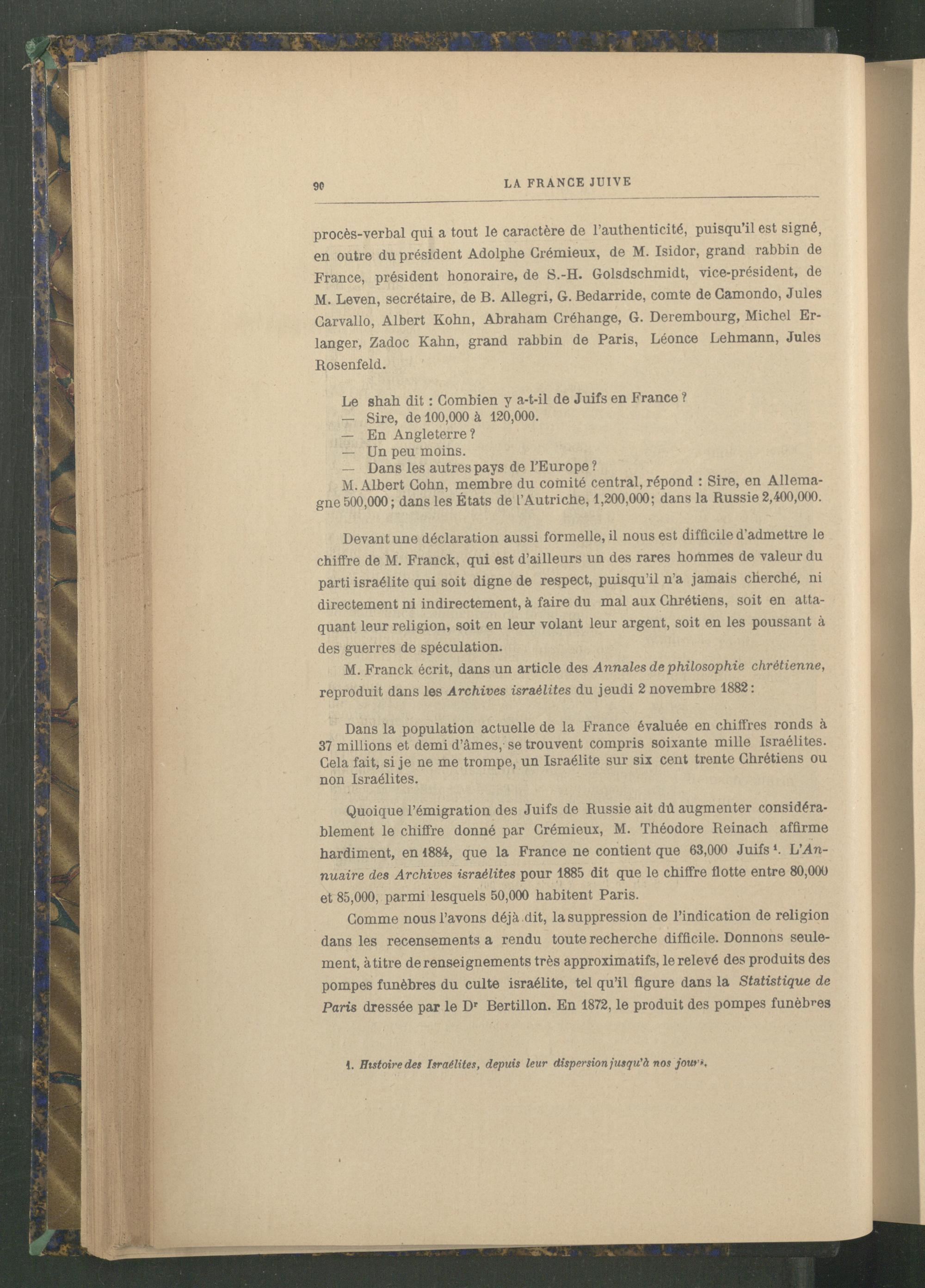 Quoique l’émigration des Juifs de Russie ait dû augmenter considérablement le chiffre donné par Crémieux , M. Théodore Reinach affirme hardiment, en 1884, que la France ne contient que 63,000 Juifs *. 1!Annuaire des Archives Israélites pour 1885 dit que le chiffre flotte entre 80,000 et 85,000, parmi lesquels 50,000 habitent Paris .