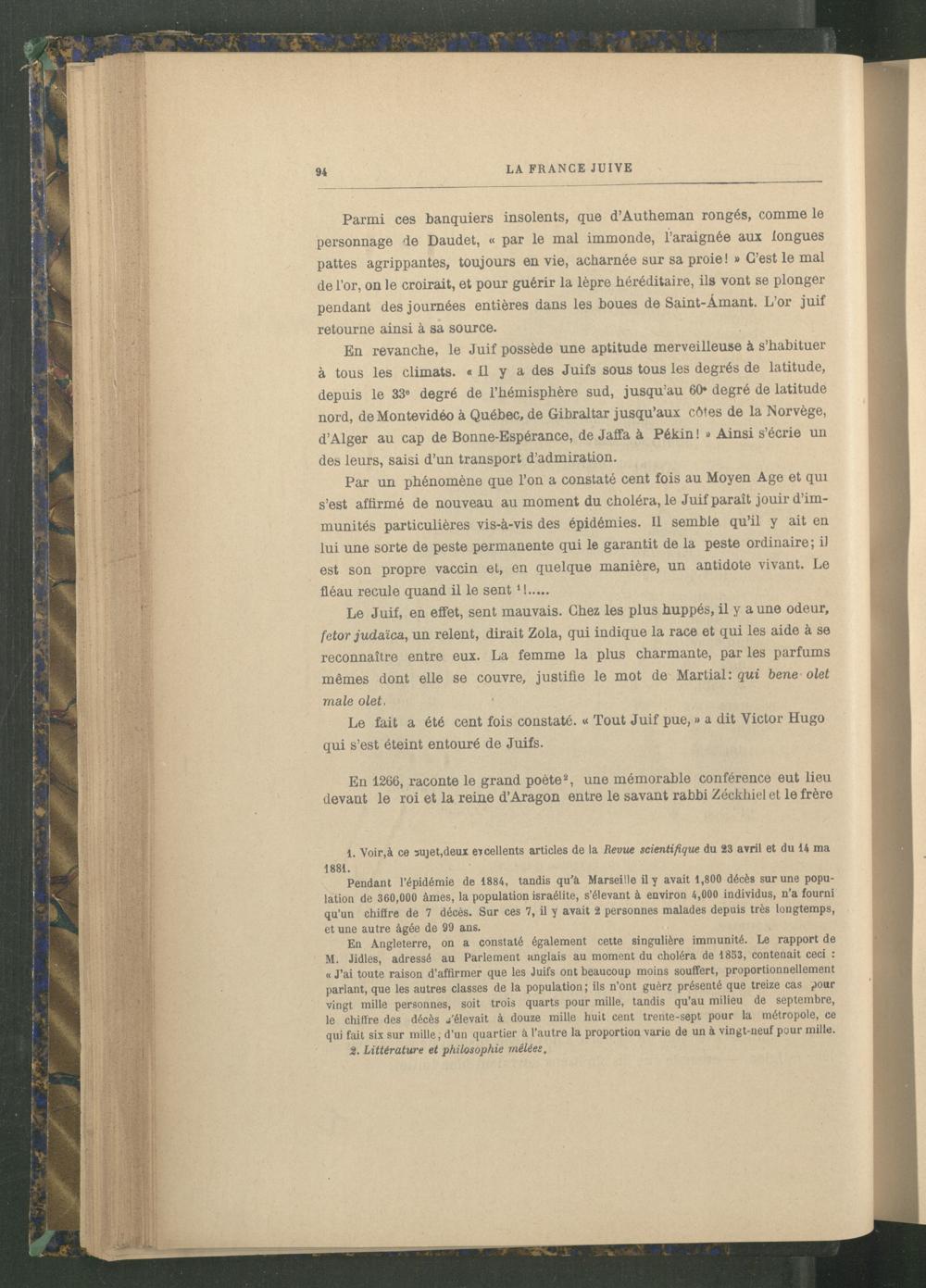 Par un phénomène que l’on a constaté cent fois au Moyen Age et qui s’est affirmé de nouveau au moment du choléra, le Juif paraît jouir d’immunités particulières vis-à-vis des épidémies. Il semble qu’il y ait en lui une sorte de peste permanente qui le garantit de la peste ordinaire; il est son propre vaccin et, en quelque manière, un antidote vivant. Le fléau recule quand il le sent 1 !.