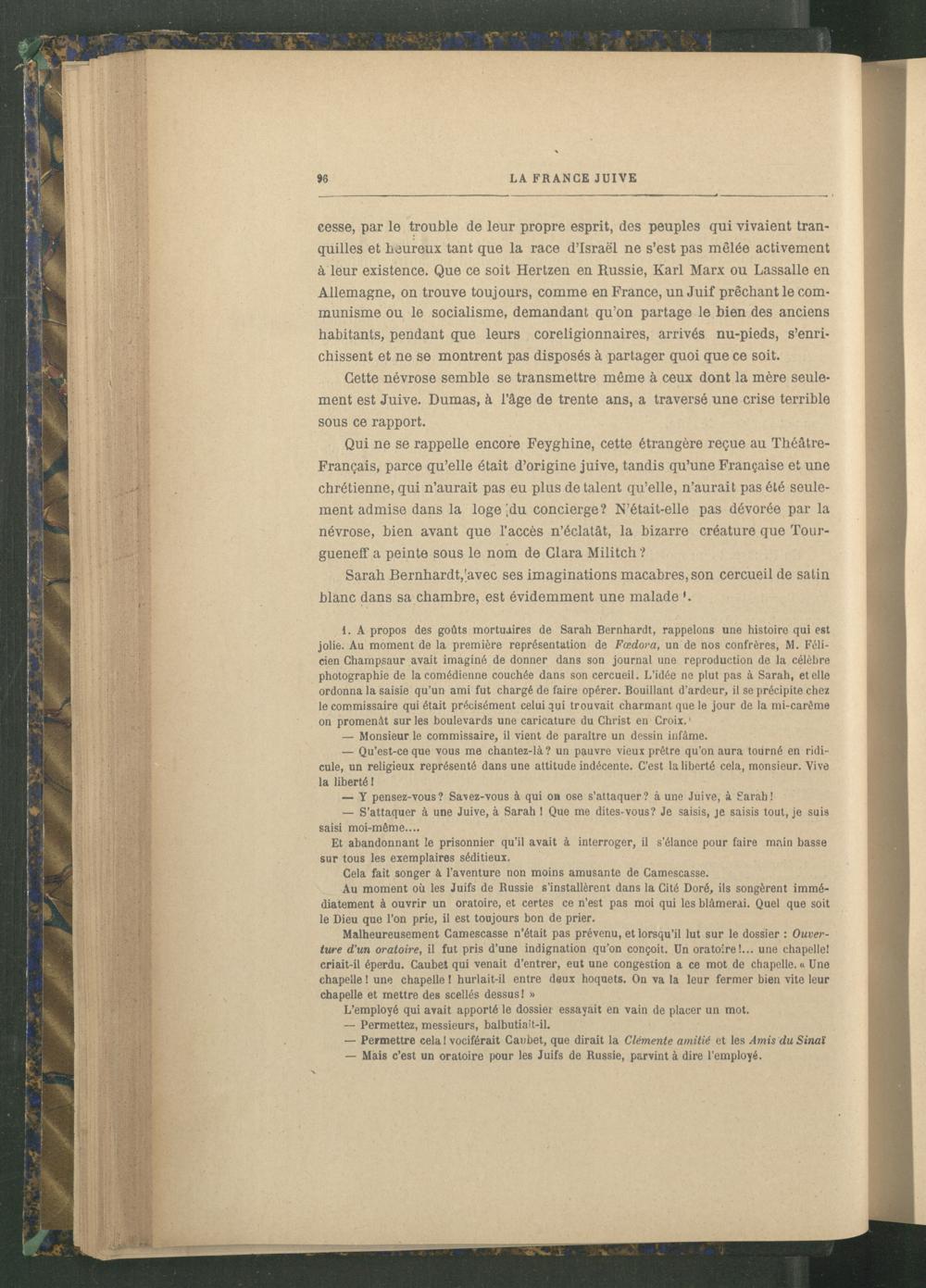 1. A propos des goûts mortuaires de Sarah Bernhardt , rappelons une histoire qui est jolie. Au moment de la première représentation de Fcedora, un de nos confrères, M. Féli cien Champsaur avait imaginé de donner dans son journal une reproduction de la célèbre photographie de la comédienne couchée dans son cercueil. L’idée ne plut pas à Sarah, et elle ordonna la saisie qu’un ami fut chargé de faire opérer. Bouillant d’ardeur, il se précipite chez le commissaire qui était précisément celui qui trouvait charmant que le jour de la mi-carême on promenât sur les boulevards une caricature du Christ en Croix. '