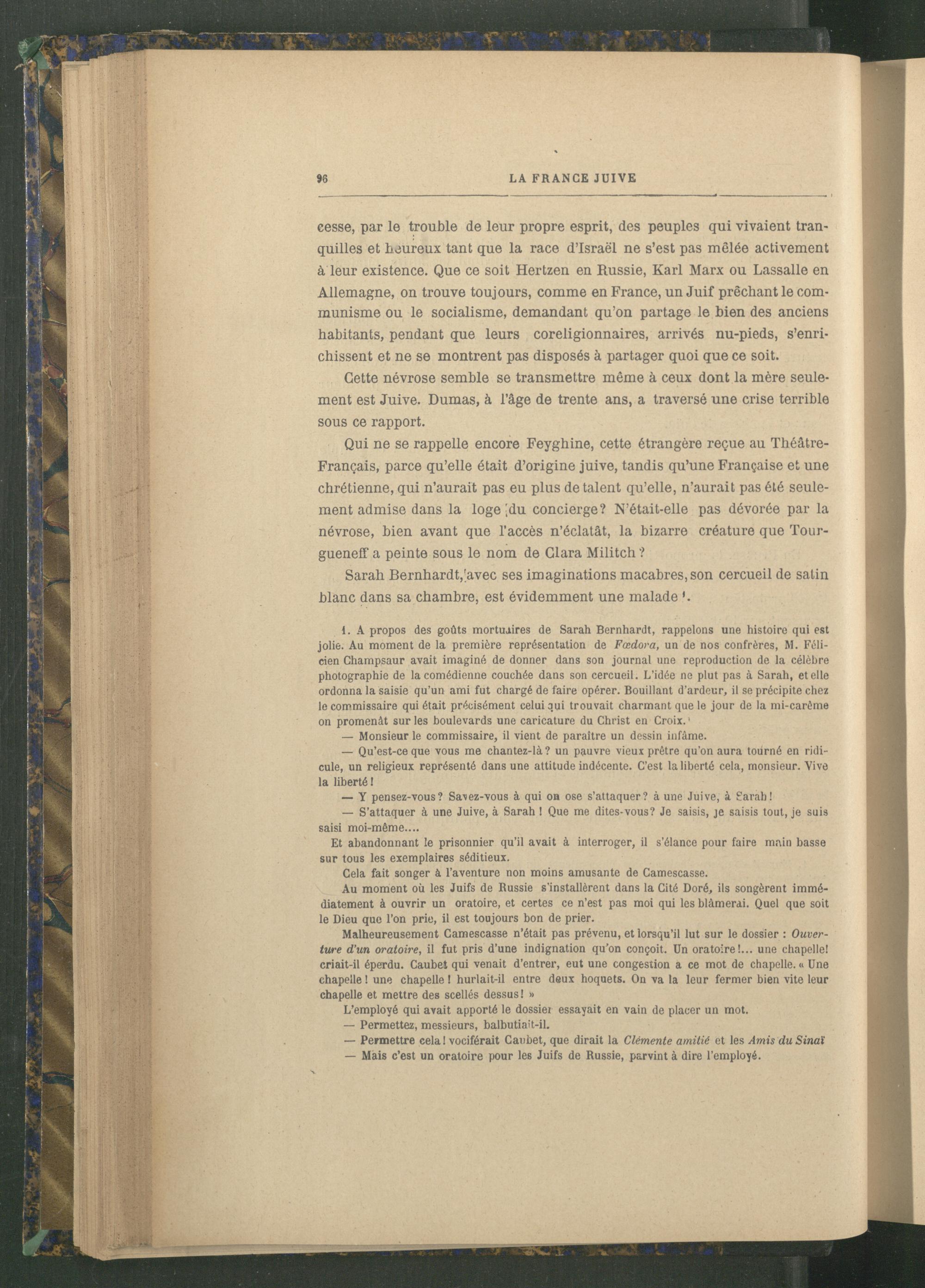 Qui ne se rappelle encore Feyghine, cette étrangère reçue au Théâtre- Français, parce qu’elle était d’origine juive , tandis qu’une Française et une chrétienne, qui n’aurait pas eu plus de talent qu’elle, n’aurait pas été seulement admise dans la loge [du concierge? N’était-elle pas dévorée par la névrose, bien avant que l’accès n’éclatât, la bizarre créature que Tour- gueneff a peinte sous le nom de Clara Militch ?