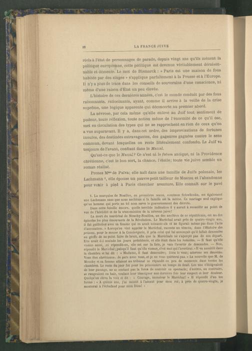 La névrose, par cela même qu’elle enlève au Juif tout sentiment de pudeur, toute réflexion, toute notion même de l’énormité de ce qu’il ose, met en circulation des types qui ne se rapprochent en rien de ceux qu’on a vus auparavant. Il y a, dans cet ordre, des improvisations de fortunes inouïes, des destinées extravagantes, des gageures gagnées contre le sens commun, devant lesquelles on reste littéralement confondu. Le Juif va toujours de l’avant, confiant dans le Mazzal.