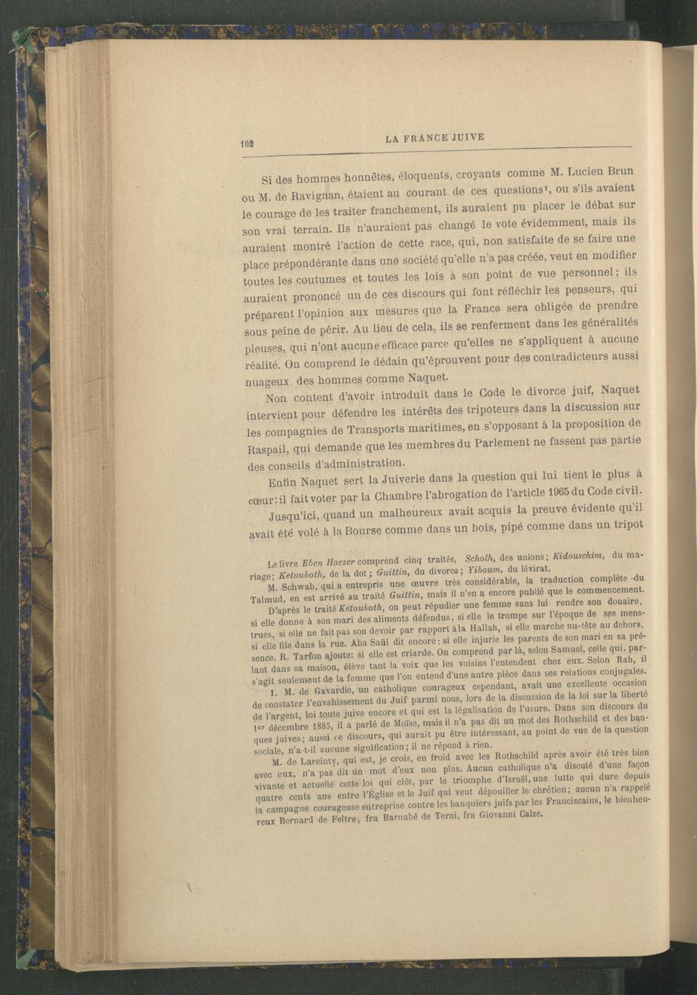 M. de Lareintv, qui est, je crois, en froid avec les Rothschild après avoir été très bien avec eux, n’a pas dit ün mot d’eux non plus. Aucun catholique n’a discuté d’une façon vivante et actuelle cette loi qui clôt, par le triomphe d’Israël , une lutte qui dure depuis quatre cenfs ans entre l’Église et le Juif qui veut dépouiller le chrétien ; aucun n’a rappelé la campagne courageuse entreprise contre les banquiers juifs par les Franciscains, le bienheureux Bernard de Feltre, fra Barnabé de Terni, fra Giovanni Calze.