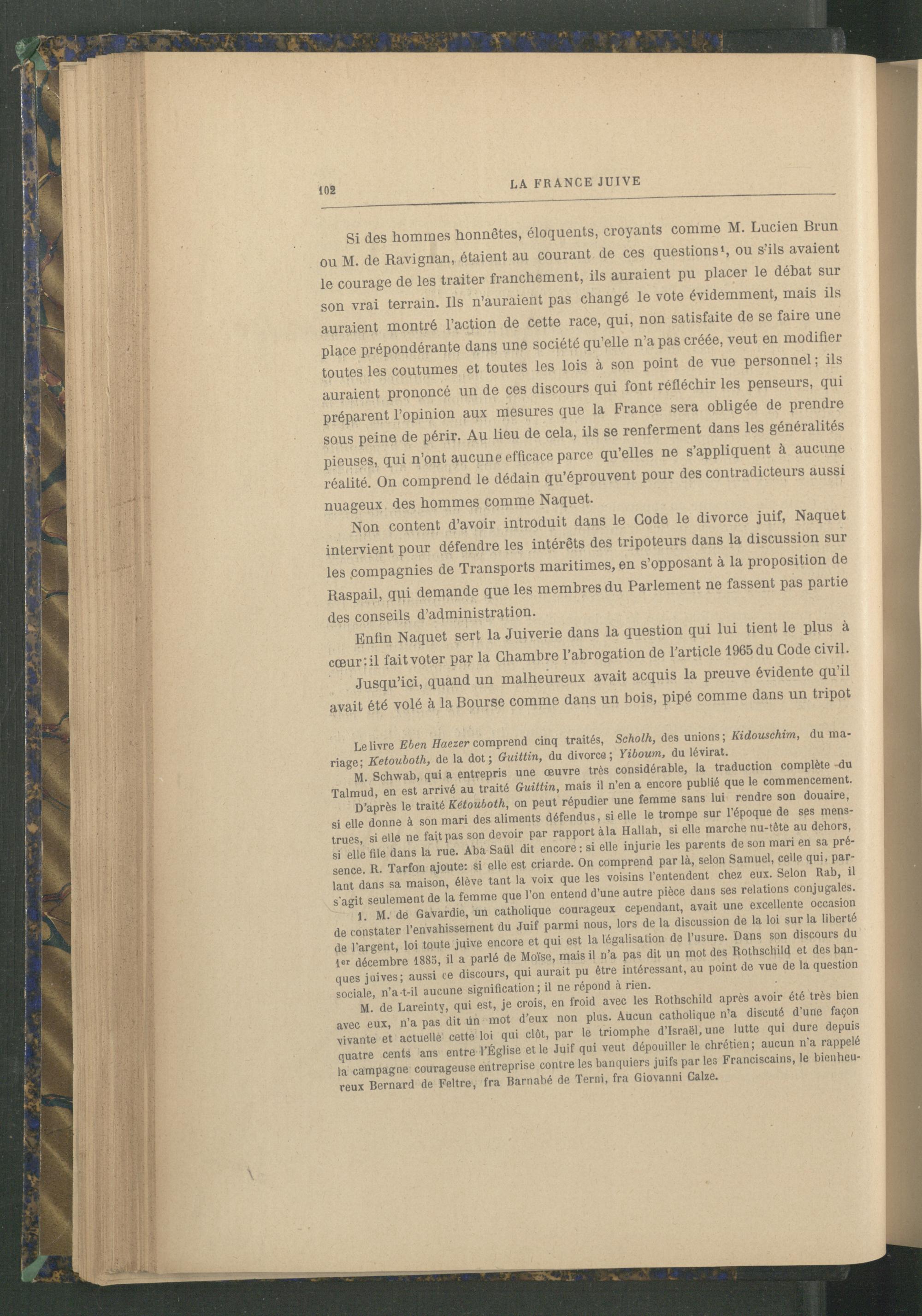 1. M. de Gavardie, un catholique courageux cependant, avait une excellente occasion de constater l’envahissement du Juif parmi nous, lors de la discussion de la loi sur la liberté de l’argent, loi toute juive encore et qui est la légalisation de l'usure. Dans son discours du for décembre 1885, il a parlé de Moïse , mais il n’a pas dit un mot des Rothschild et des banques juives; aussi ce discours, qui aurait pu être intéressant, au point de vue de la question sociale, n’a-t-il aucune signification; il ne répond à rien.