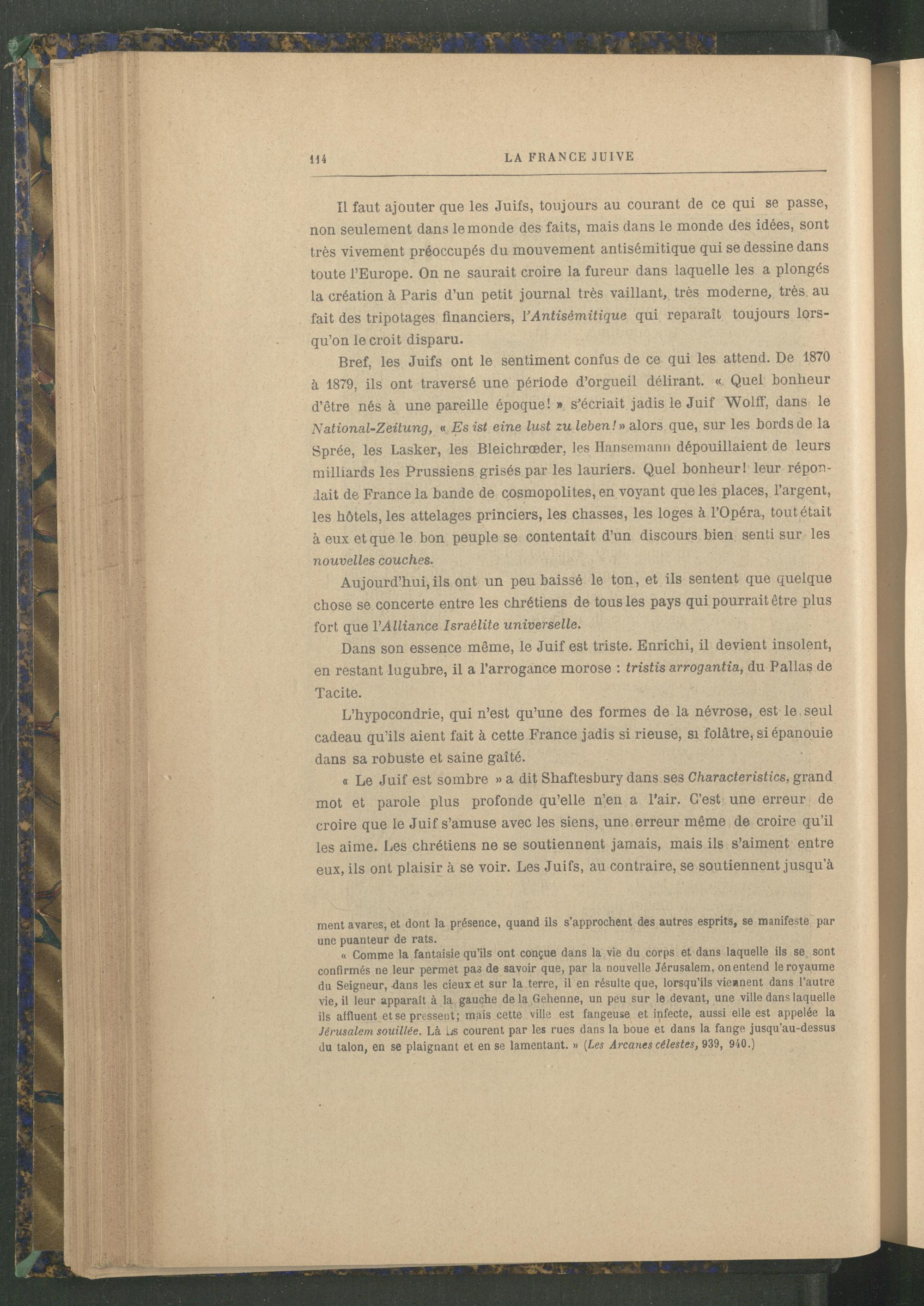 Bref, les Juifs ont le sentiment confus de ce qui les attend. De 1870 à 1879, ils ont traversé une période d’orgueil délirant. « Quel bonheur d’être nés à une pareille époque! » s’écriait jadis le Juif Wolff, dans le National-Zeitung, « Es ist eine lust zu leben!» alors que, sur les bords de la Sprée, les Lasker , les Bleichrœder, les Ilansemann dépouillaient de leurs milliards les Prussiens grisés par les lauriers. Quel bonheur! leur répondait de France la bande de cosmopolites, en voyant que les places, l’argent, les hôtels, les attelages princiers, les chasses, les loges à l’Opéra, tout était à eux et que le bon peuple se contentait d’un discours bien senti sur les nouvelles couches.