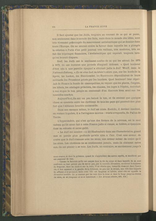 « Le Juif est sombre » a dit Shaftesbury dans ses Characteristics, grand mot et parole plus profonde qu’elle n’en a l’air. C’est une erreur de croire que le Juif s’amuse avec les siens, une erreur même de croire qu’il les aime. Les chrétiens ne se soutiennent jamais, mais ils s’aiment entre eux, ils ont plaisir à se voir. Les Juifs, au contraire, se soutiennent jusqu’à