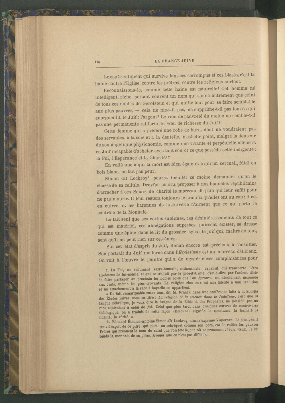Simon dit Lockroy 3 pourra insulter ce moine, demander qu’on le chasse de sa cellule. Dreyfus pourra proposer à nos honnêtes républicains d’arracher à ces Sœurs de charité le morceau de pain qui leur suffit pour ne pas mourir. Il leur restera toujours le crucifix qu’elles ont au cou ; il est en cuivre, et les baronnes de laJuivene n’aiment que ce qui porte le contrôle de la Monnaie.