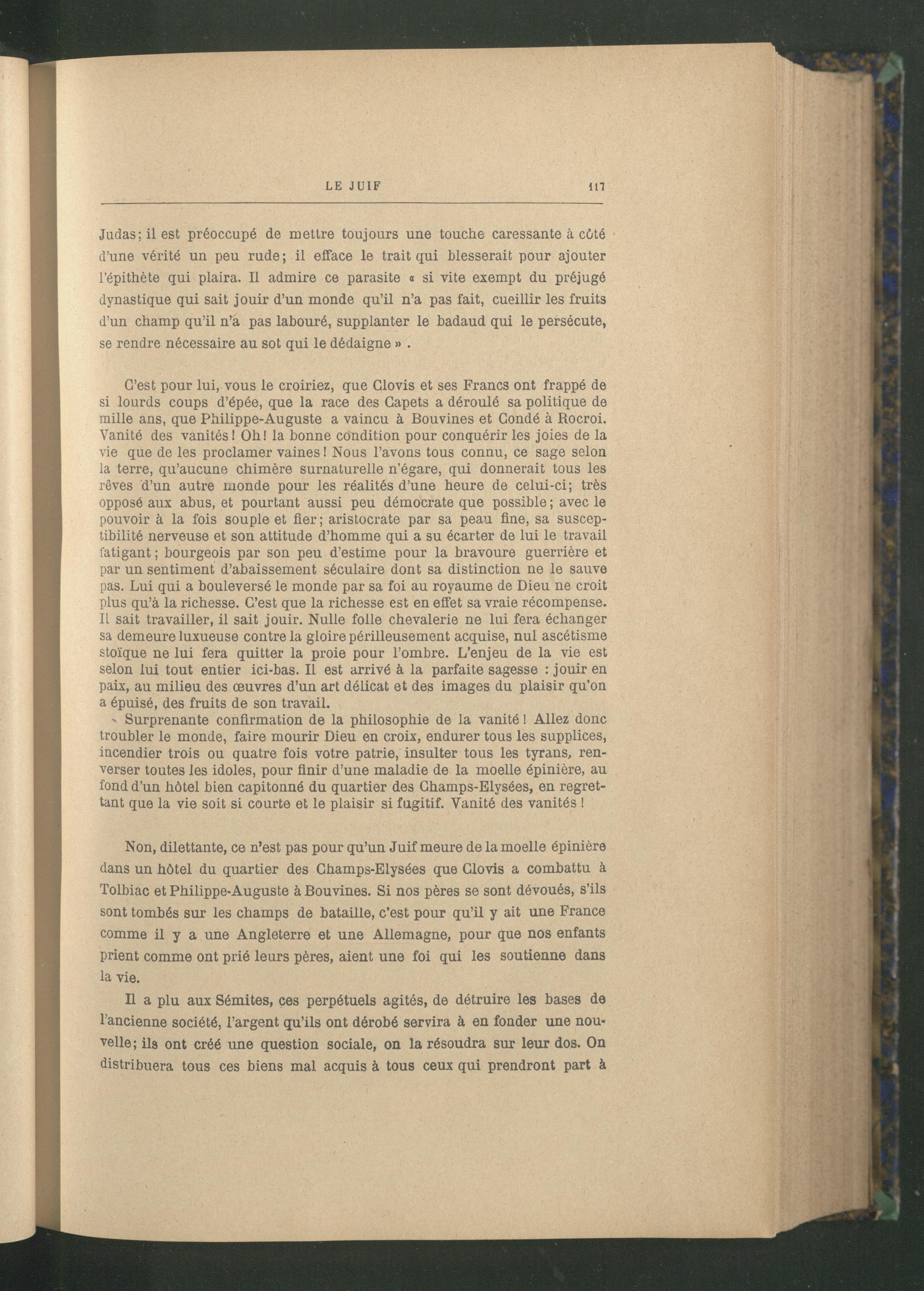 Non, dilettante, ce n’est pas pour qu’un Juif meure de la moelle épinière dans un hôtel du quartier des Champs-Elysées que Clovis a combattu à Tolbiac et Philippe-Auguste à Bouvines . Si nos pères se sont dévoués, s’ils sont tombés sur les champs de bataille, c’est pour qu’il y ait une France comme il y a une Angleterre et une Allemagne , pour que nos enfants prient comme ont prié leurs pères, aient une foi qui les soutienne dans la vie.