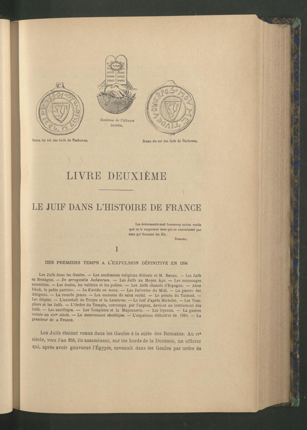 Les Juifs dans les Gaules . — Les sentiments religieux délicats et M. Renan. — Les Juifs en Bretagne . — De arrogantia Judæorum. — Les Juifs au Moyen Age . — Les mensonges accrédités. — Les écoles, les rabbins et les poètes. — Les Juifs chassés d’Espagne. — Abou Iskak, le poète patriote. — LaKacida en noun. — Les Juiveries du Midi. — La guerre des Albigeois . — La rouelle jaune. — Les mesures de salut social. — Le procès du Talmud. — Les élégies. — L’autodafé de Troyes et la Lanterne. — Le Juif d’après Michelet . — Les Templiers et les Juifs. — L’Ordre du Temple , corrompu par l’argent, devient un instrument des Juifs. — Les sacrilèges. — Les lempliers et la Maçonnerie . — Les lépreux. — La guerre sociale au xiv« siècle. — Le mouvement sémitique. — L’expulsion définitive de 1394. — La grandeur de >a France .