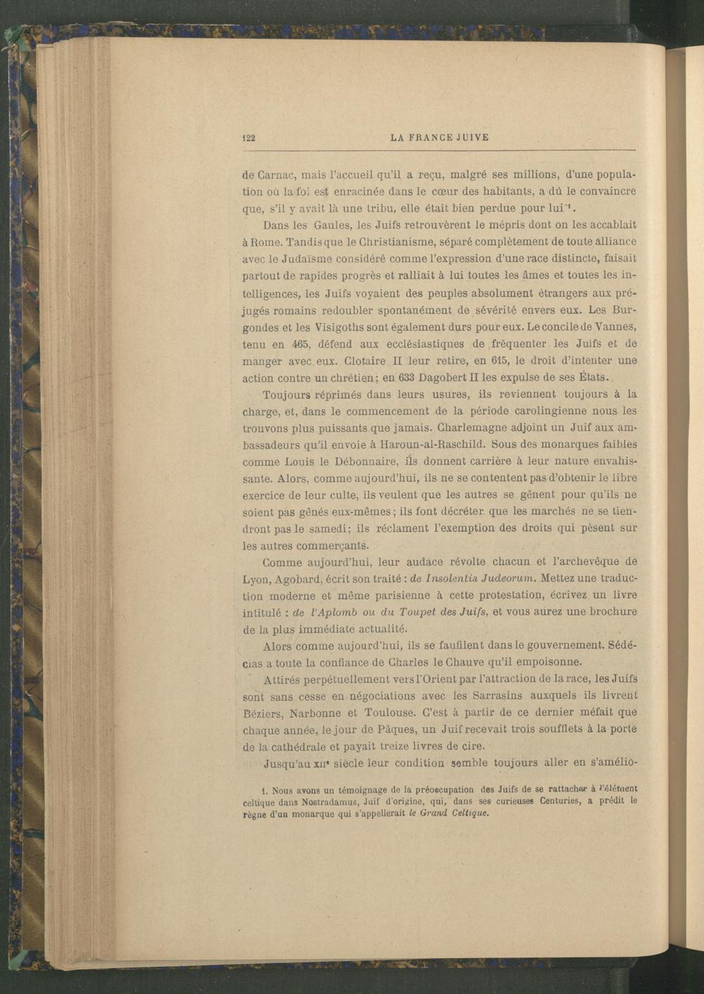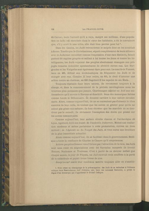Gomme aujourd’hui, leur audace révolte chacun et l’archevêque de Lyon, Agobard , écrit son traité : de Insolentia Judeorum. Mettez une traduction moderne et même parisienne à cette protestation, écrivez un livre intitulé : de VAplomb ou du Toupet des Juifs, et vous aurez une brochure de la plus immédiate actualité.