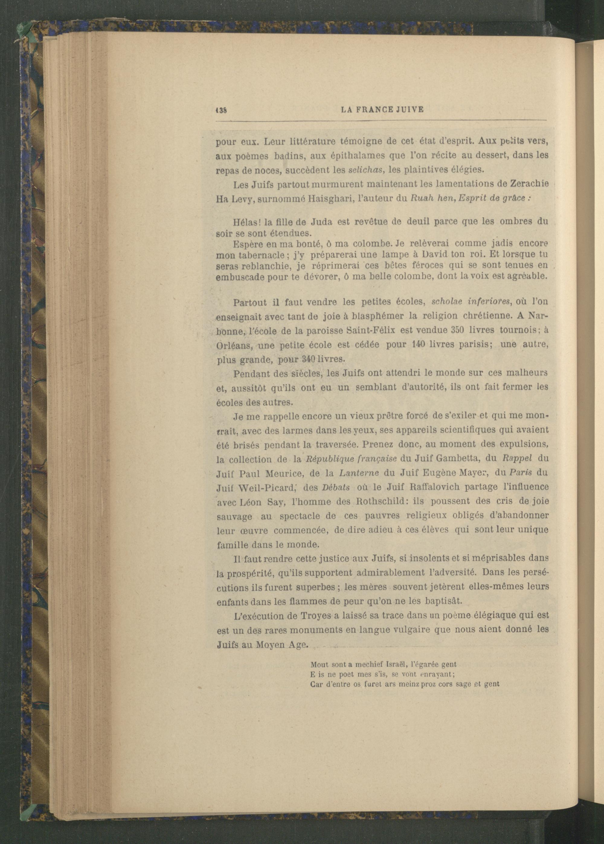 Je me rappelle encore un vieux prêtre forcé de s’exiler et qui me montrait, avec des larmes dans les yeux, ses appareils scientifiques qui avaient été brisés pendant la traversée. Prenez donc, au moment des expulsions, la collection de la République française du Juif Gambetta, du Rappel du Juif Paul Meurice , de la Lanterne du Juif Eugène Mayer , du Paris du Juif Weil-Picard,' des Débats où le Juif Raffalovich partage l’influence avec Léon Say , l’homme des Rothschild : ils poussent des cris de joie sauvage au spectacle de ces pauvres religieux obligés d’abandonner leur œuvre commencée, de dire adieu à ces élèves qui sont leur unique famille dans le monde.
