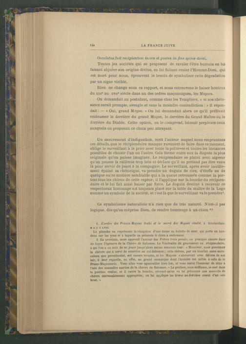 2. En province, nous apprend l’auteur des Frères L'ois points, on pratique encore dans îes loges l’épreuve de la Chèvre de Salomon. Le Vénérable dit gravement au récipiendaire, à qui l’on a eu soin de ne jouer jusqu’alors aucun mauvais tour: « Monsieur, nous possédons la chèvre qui a servi de nourrice au roi Salomon ; cette chèvre, par un bienfait aussi miraculeux que providentiel, est encore vivante, et les Maçons s’abreuvent avec délices de son lait; il leur rappelle, en effet, un grand monarque dont l’histoire est mêlée à celle de la Franc-Maçonnerie . Vous allez vous agenouiller bien bas, et vous aurez l’honneur de téter à l’une des mamelles sacrées de la chèvre de Salomon. » Le profane, sans méfiance, se met dans la position voulue, et il ouvre la bouche, croyant qu’on va lui présenter une mamelle de chèvre convenablement appropriée ; on lui applique les lèvres au derrière crotté d’un sale bouc. »