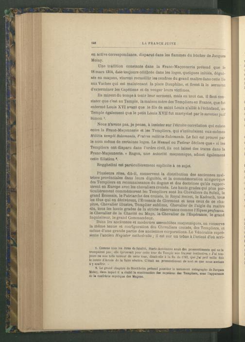 Nous n’avons pas, je pense, à insister sur l’étroite corrélation qui existe entre la Franc-Maçonnerie et les Templiers , qui s’intitulaient eux-mômes Militia templi Salomonis, Fratres militiæ Salomonis. Le fait est prouvé par le nom môme de certaines loges. Le Manuel ou Tuileur déclare que « si les Templiers ont disparu dans l’ordre civil, ils ont laissé des traces dans la Franc-Maçonnerie . » Ragon, une autorité maçonnique, admet également cette filiation *.