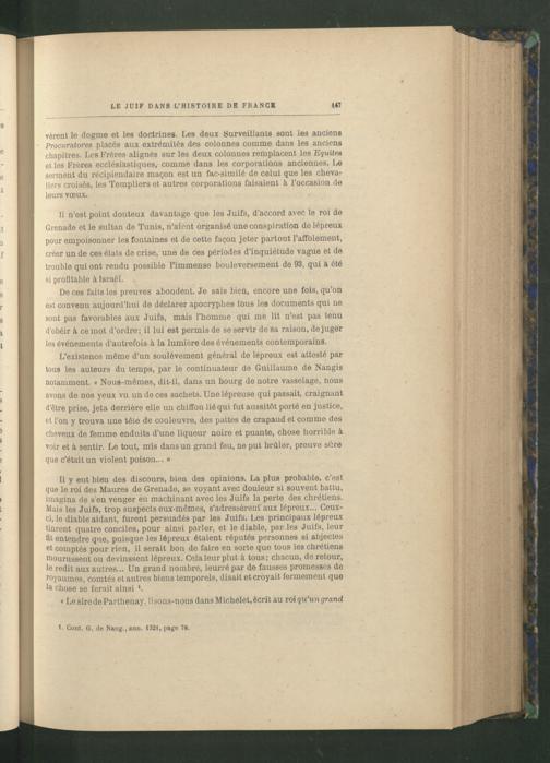 Il n'est point douteux davantage que les Juifs, d'accord avec le roi de Grenade et le sultan de Tunis , n'aient organisé une conspiration de lépreux pour empoisonner les fontaines et de cette façon jeter partout l'affolement, créer un de ces états de crise, une de ces périodes d'inquiétude vague et de trouble qui ont rendu possible l'immense bouleversement de 93, qui a été si profitable à Israël .