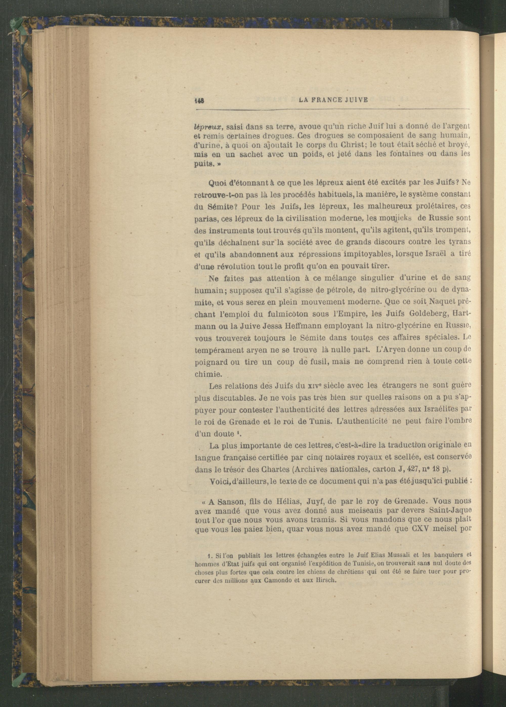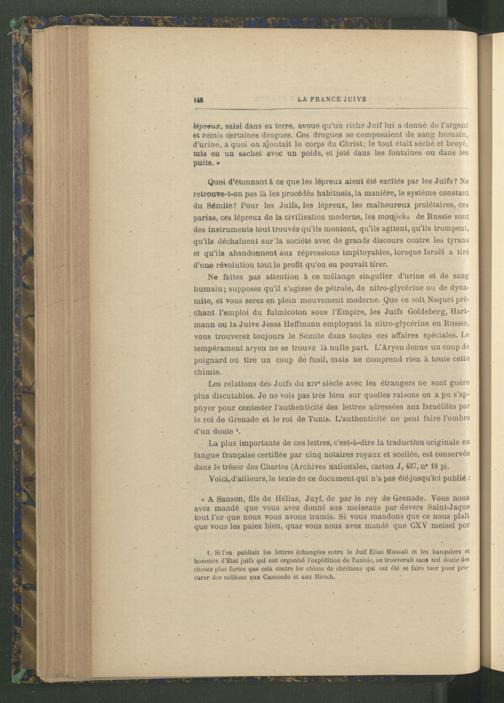 1. Si l'on publiait les lettres échangées entre le Juif Elias Mussali et les banquiers et hommes d’Etat juif3 qui ont organisé l'expédition de Tunisie , on trouverait sans nul doute des choses plus fortes que cela contre les chiens de chrétiens qui ont été se faire tuer pour procurer dos millions aux Camondo et aux Hirsch.