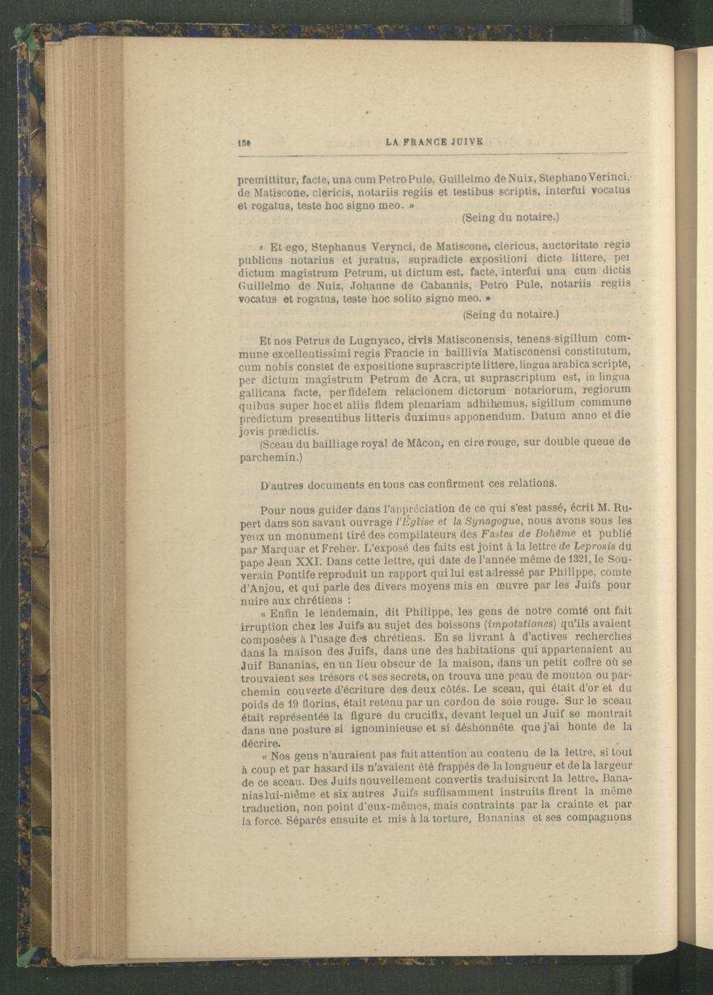« Enfin le lendemain, dit Philippe, les gens de notre comté ont fait irruption chez les Juifs au sujet des boissons ( impotationes ) qu’ils avaient composées à l’usage des chrétiens. En se livrant à d’actives recherches dans la maison des Juifs, dans une des habitations qui appartenaient au Juif Bananias, en un lieu obscur de la maison, dans un petit coffre où se trouvaient ses trésors et ses secrets, on trouva une peau de mouton ou parchemin couverte d’écriture des deux côtés. Le sceau, qui était d’or et du poids de 19 florins, était retenu par un cordon de soie rouge. Sur le sceau était représentée la figure du crucifix, devant lequel un Juif se montrait dans une posture si ignominieuse et si déshonnête que j’ai honte de la décrire.