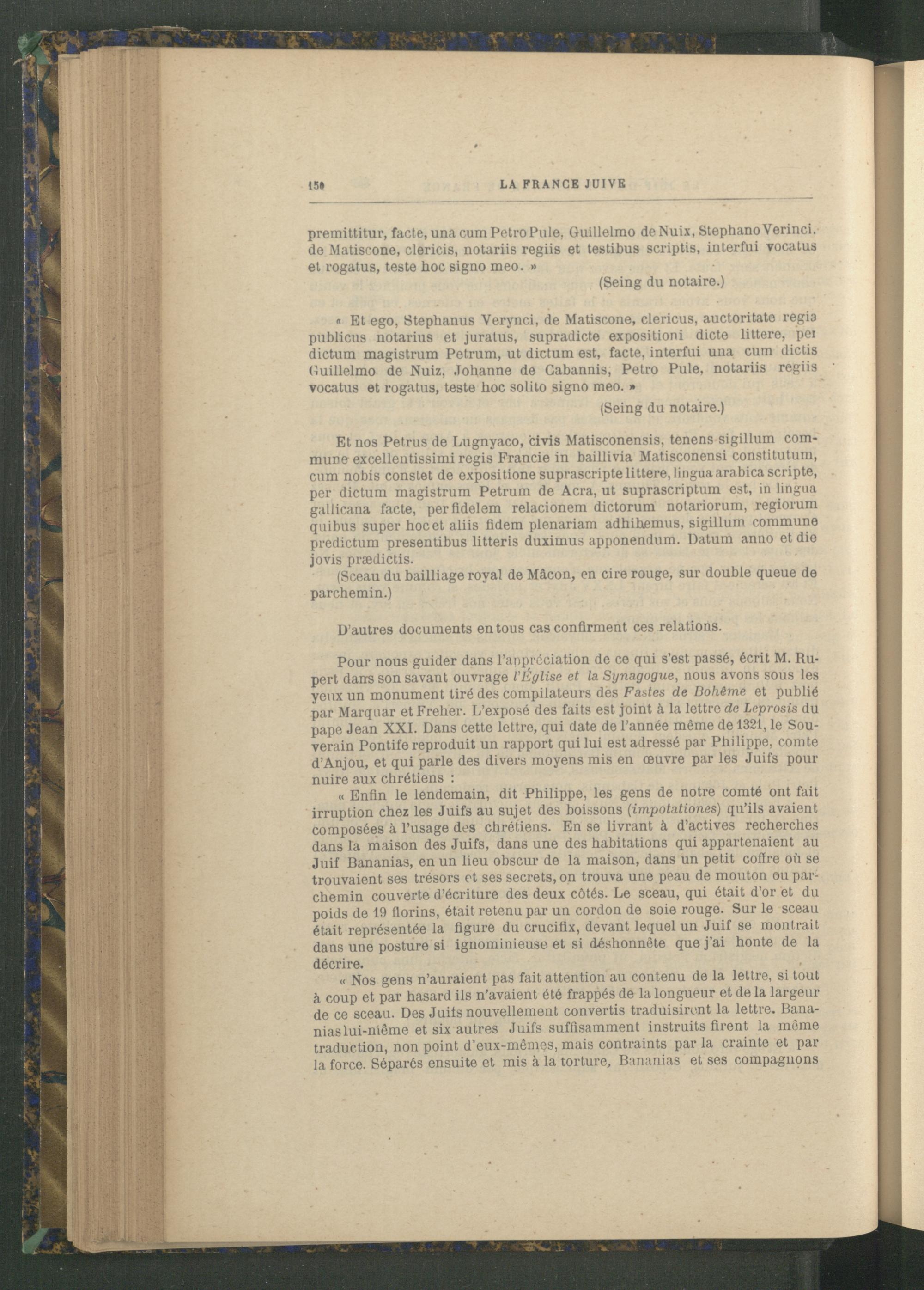 Pour nous guider dans l’anpréciation de ce qui s’est passé, écrit M. Rupert dans son savant ouvrage l'Église et la Synagogue, nous avons sous les yeux un monument tiré des compilateurs des Fastes de Bohême et publié par Marquar et Freher. L’exposé des faits est joint à la lettre de Leprosis du pape Jean XXI. Dans cette lettre, qui date de l’année même de 1321, le Souverain Pontife reproduit un rapport qui lui est adressé par Philippe, comte d’Anjou, et qui parle des divers moyens mis en œuvre par les Juifs pour nuire aux chrétiens :