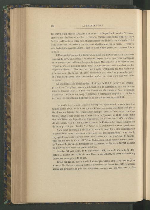 La soudaineté de décision dont Philippe le Bel fit preuve en arrêtant partout les Templiers sauva du Sémitisme la Chrétienté, comme la victoire de Charles-Martel , à Poitiers , l’avait sauvée du même fléau six siècles auparavant, connue un coup vigoureux et simultané frappé sur les Juifs par tous les souverains d’Europe la sauverait encore aujourd’hui.