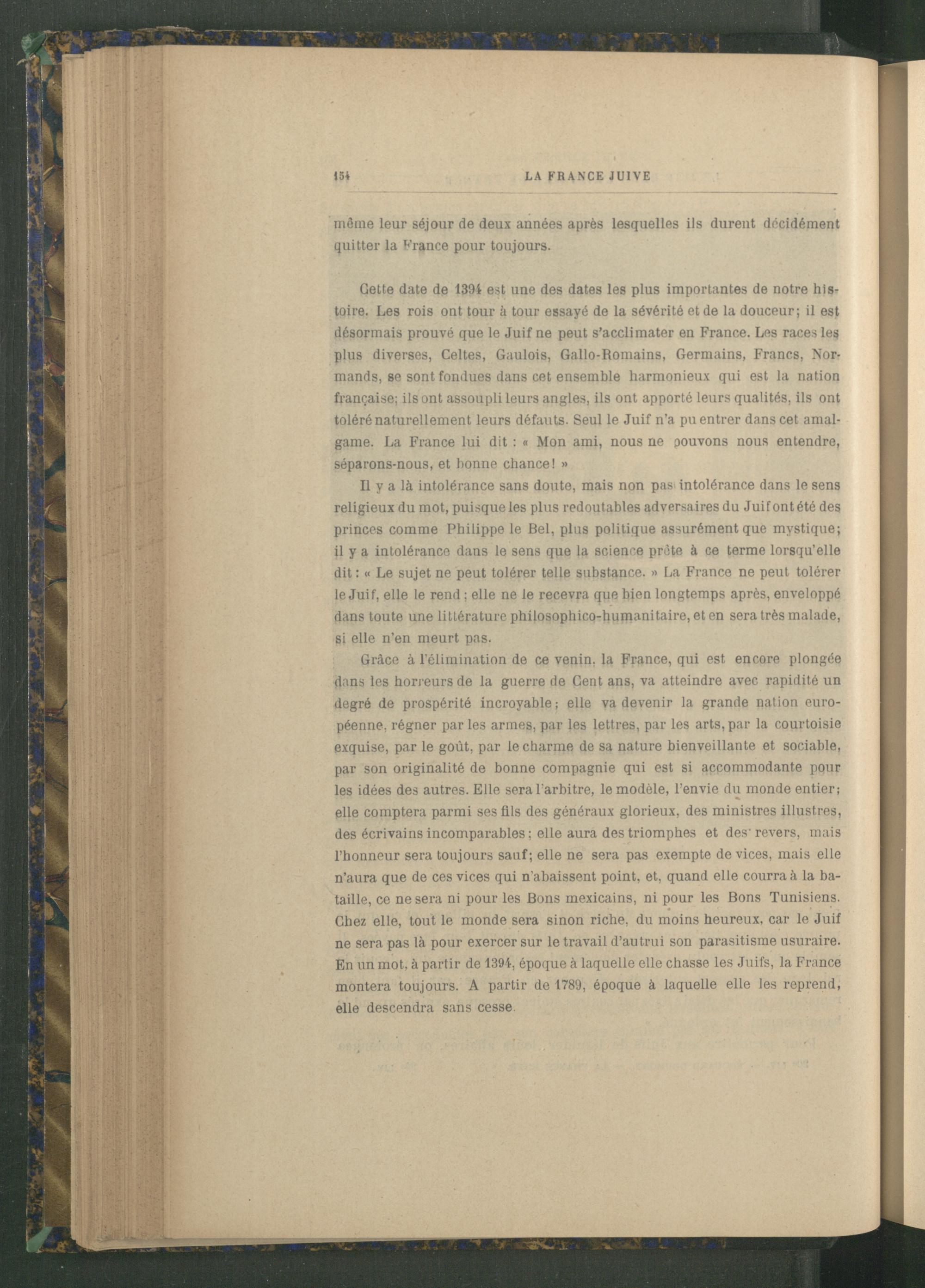 Cette date de 1394 est une des dates les plus importantes de notre histoire. Les rois ont tour à tour essayé de la sévérité et de la douceur; il est désormais prouvé que le Juif ne peut s’acclimater en France . Les races les plus diverses, Celtes , Gaulois , Gallo-Romains, Germains, Francs , Nor mands , se sont fondues dans cet ensemble harmonieux qui est la nation française; ils ont assoupli leurs angles, ils ont apporté leurs qualités, ils ont toléré naturellement leurs défauts. Seul le Juif n’a pu entrer dans cet amalgame. La France lui dit : « Mon ami, nous ne pouvons nous entendre, séparons-nous, et bonne chance! »