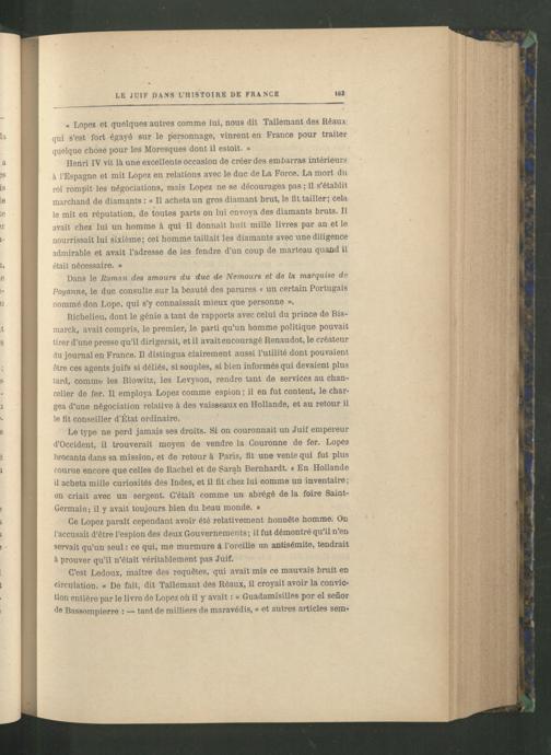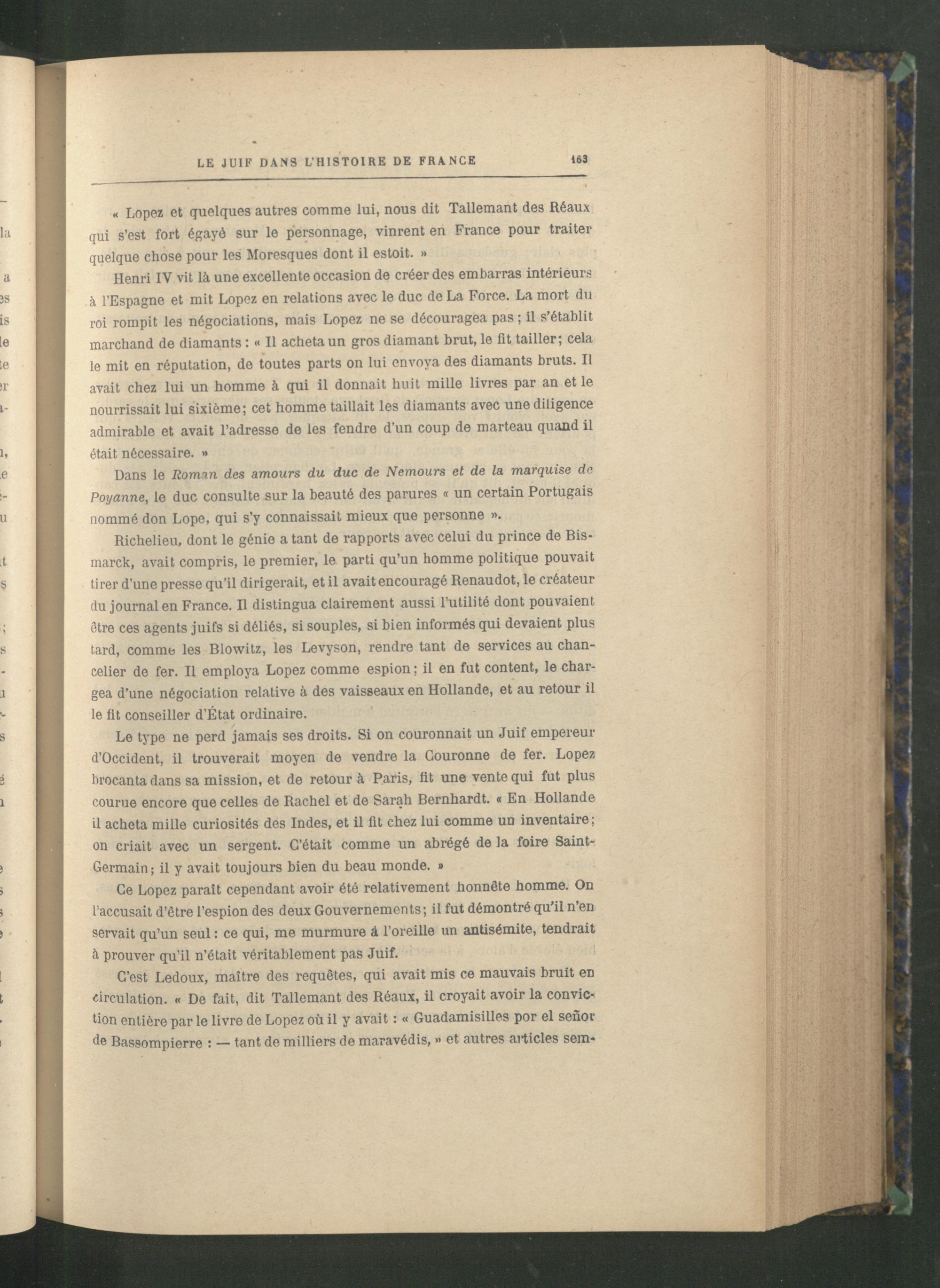 Richelieu, dont le génie a tant de rapports avec celui du prince de Bismarck, avait compris, le premier, le parti qu’un homme politique pouvait tirer d’une presse qu’il dirigerait, et il avait encouragé Renaudot, le créateur du journal en France . Il distingua clairement aussi l’utilité dont pouvaient être ces agents juifs si déliés, si souples, si bien informés qui devaient plus tard, comme les Blowitz, les Levyson, rendre tant de services au chancelier de fer. Il employa Lopez comme espion ; il en fut content, le chargea d’une négociation relative à des vaisseaux en Hollande, et au retour il le fit conseiller d’État ordinaire.