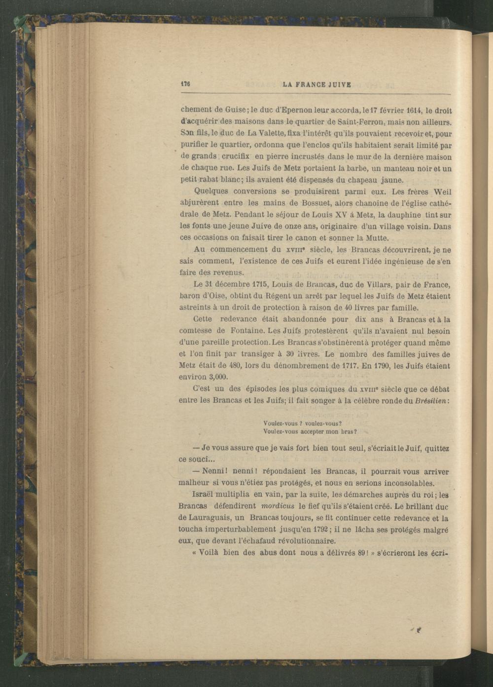 Le 31 décembre 1715, Louis de Brancas , duc de Villars, pair de France, baron d’Oise , obtint du Régent un arrêt par lequel les Juifs de Metz étaient astreints à un droit de protection à raison de 40 livres par famille.