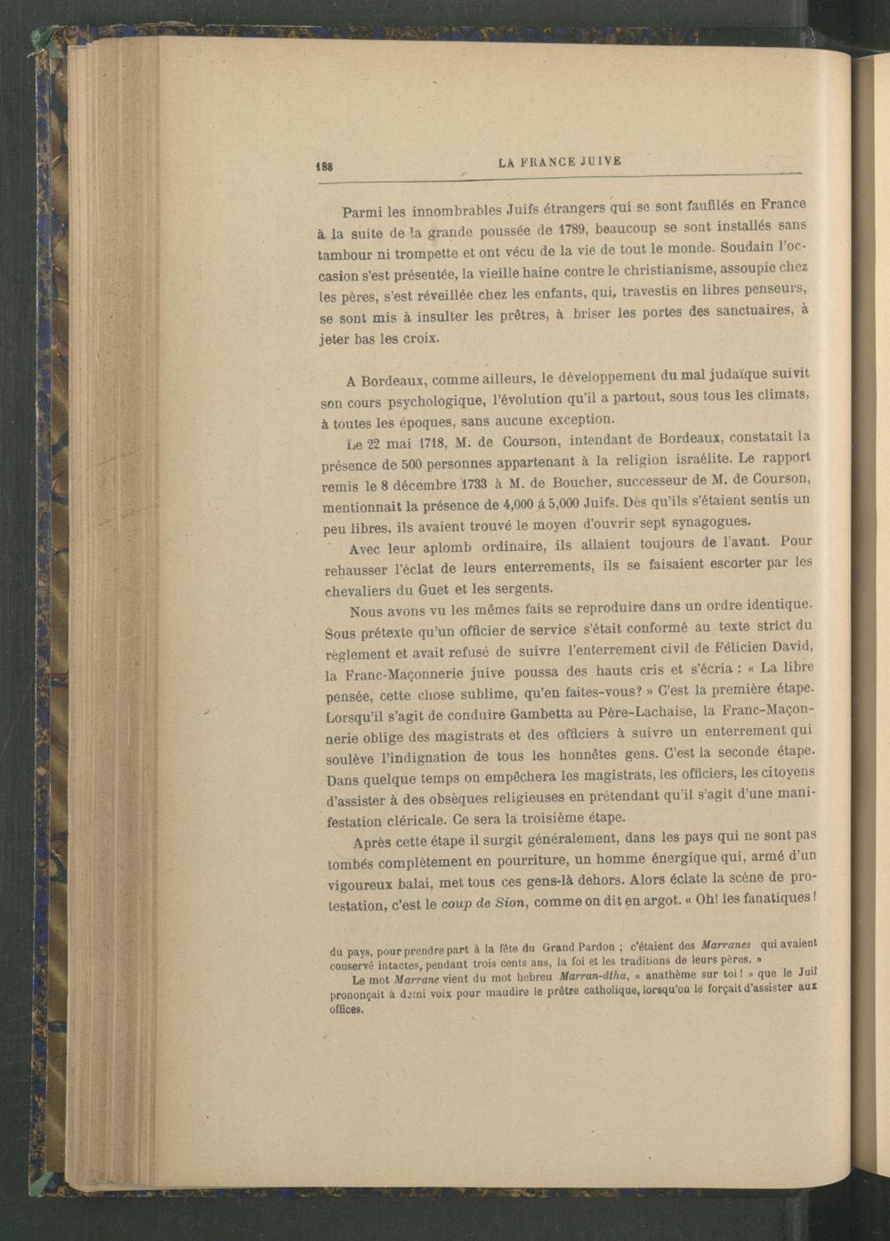 A Bordeaux , comme ailleurs, le développement du mal judaïque suivit son cours psychologique, l’évolution qu’il a partout, sous tous les climats, à toutes les époques, sans aucune exception.