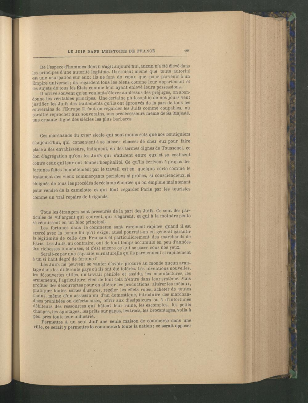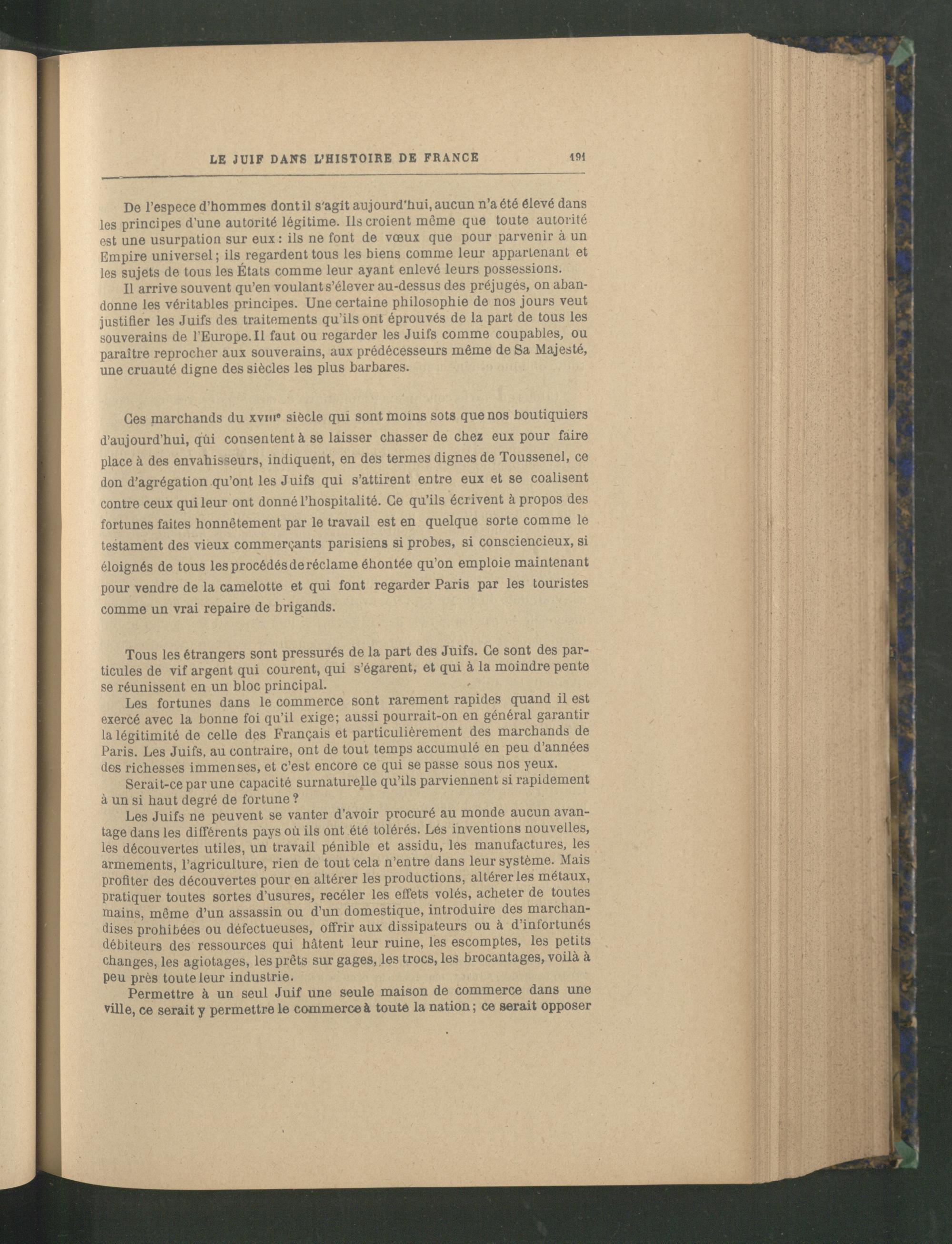 Les fortunes dans le commerce sont rarement rapides quand il est exercé avec la bonne foi qu’il exige; aussi pourrait-on en général garantir la légitimité de celle des Français et particulièrement des marchands de Paris . Les Juifs, au contraire, ont de tout temps accumulé en peu d’années dos richesses immenses, et c’est encore ce qui se passe sous nos yeux.