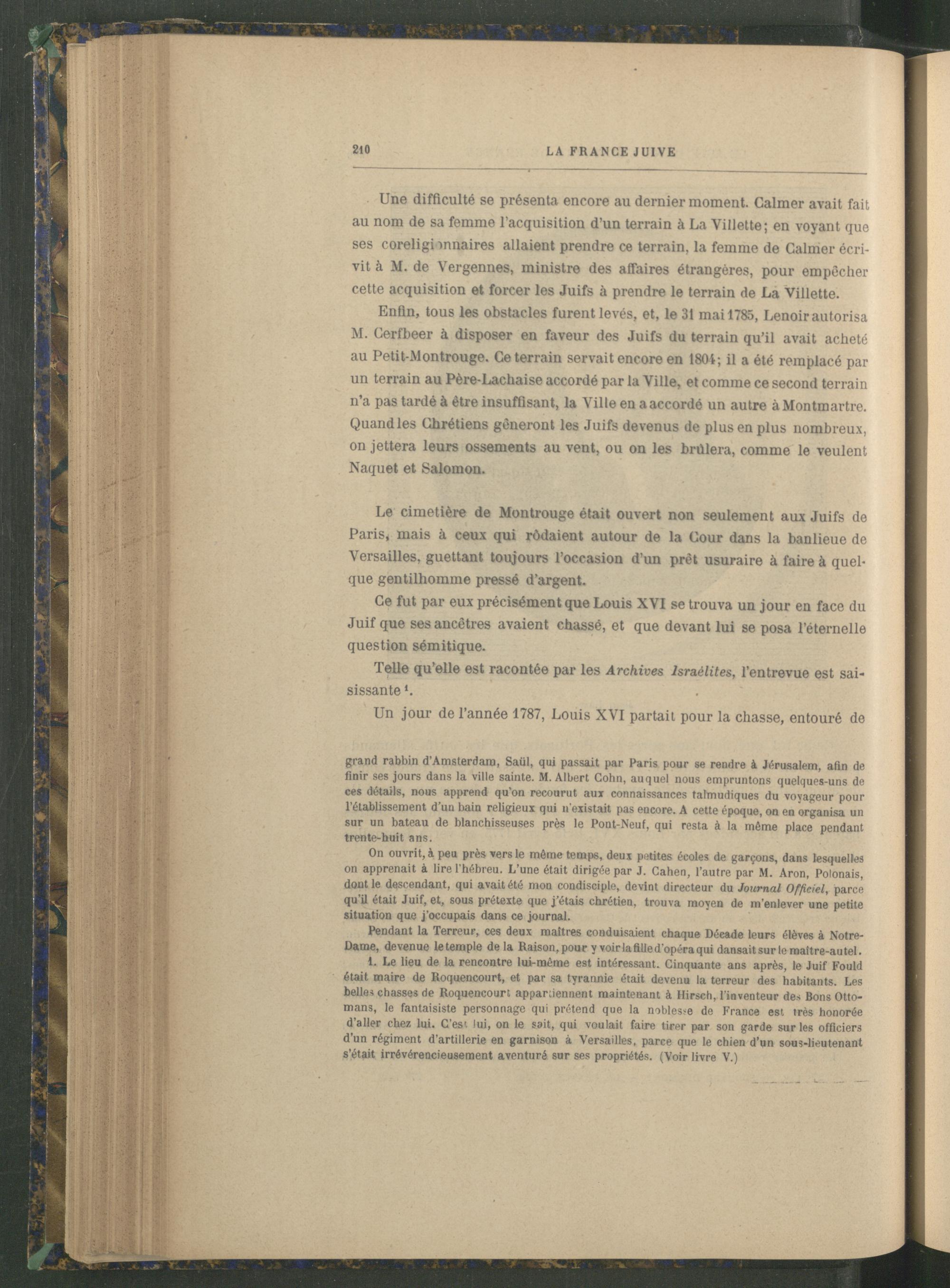 Enfin, tous les obstacles furent levés, et, le 31 mai 1785, Lenoir autorisa M. Cerfbeer à disposer en faveur des Juifs du terrain qu’il avait acheté au Petit-Montrouge. Ce terrain servait encore en 180i; il a été remplacé par un terrain au Père-Lachaise accordé par la Ville, et comme ce second terrain n’a pas tardé à être insuffisant, la Ville en a accordé un autre à Montmartre . Quandles Chrétiens gêneront les Juifs devenus de plus en plus nombreux, on jettera leurs ossements au vent, ou on les brûlera, comme le veulent Naquet et Salomon.
