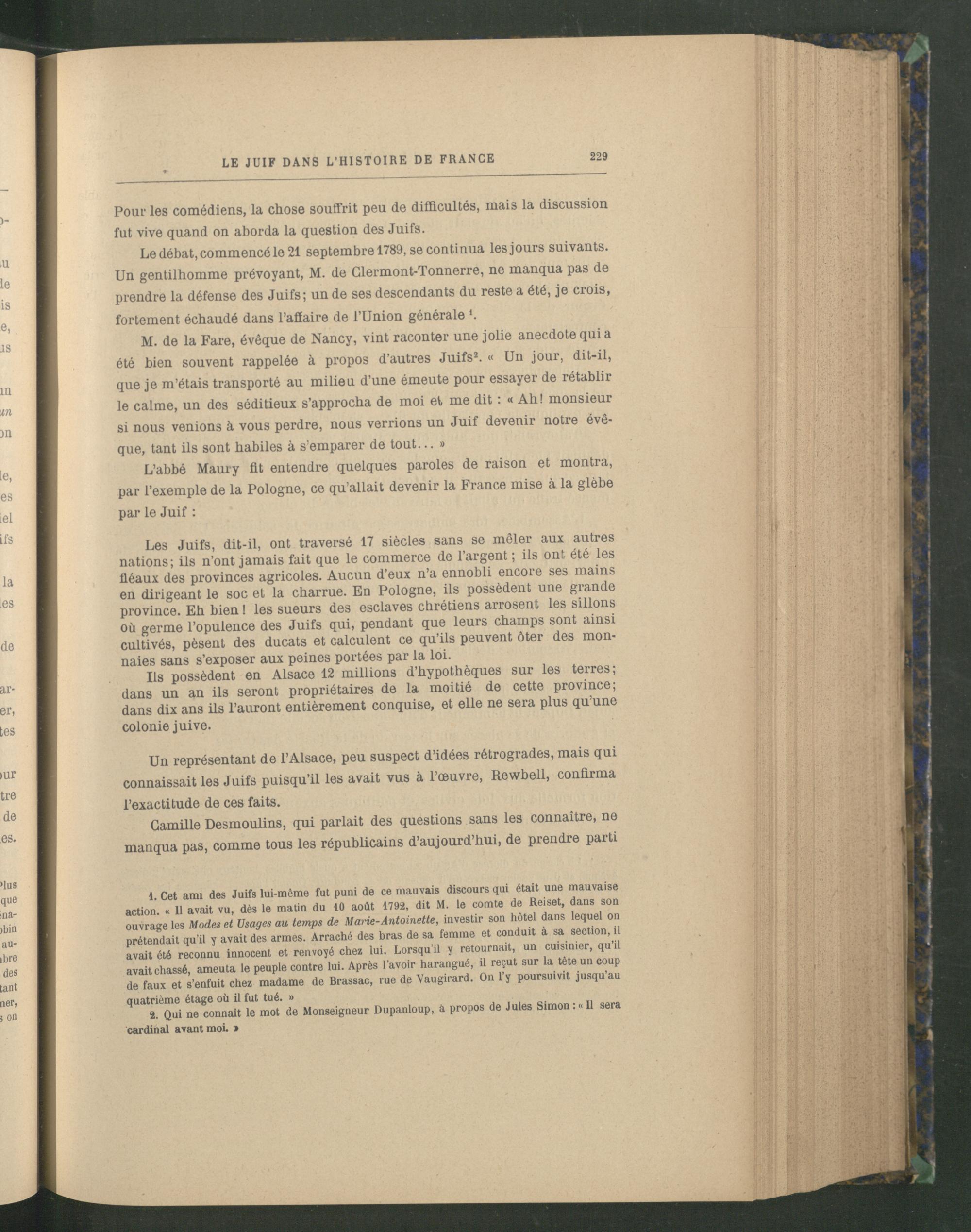 Le débat, commencé le 21 septembre 1789, se continua les jours suivants. Un gentilhomme prévoyant, M. de Clermont-Tonnerre, ne manqua pas de prendre la défense des Juifs; un de ses descendants du reste a été, je crois, fortement échaudé dans l’afiaire de l’Union générale *.