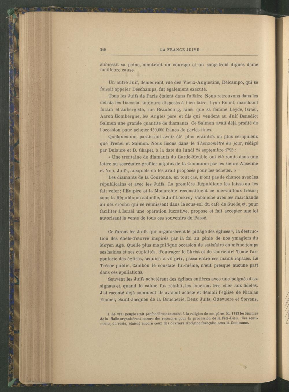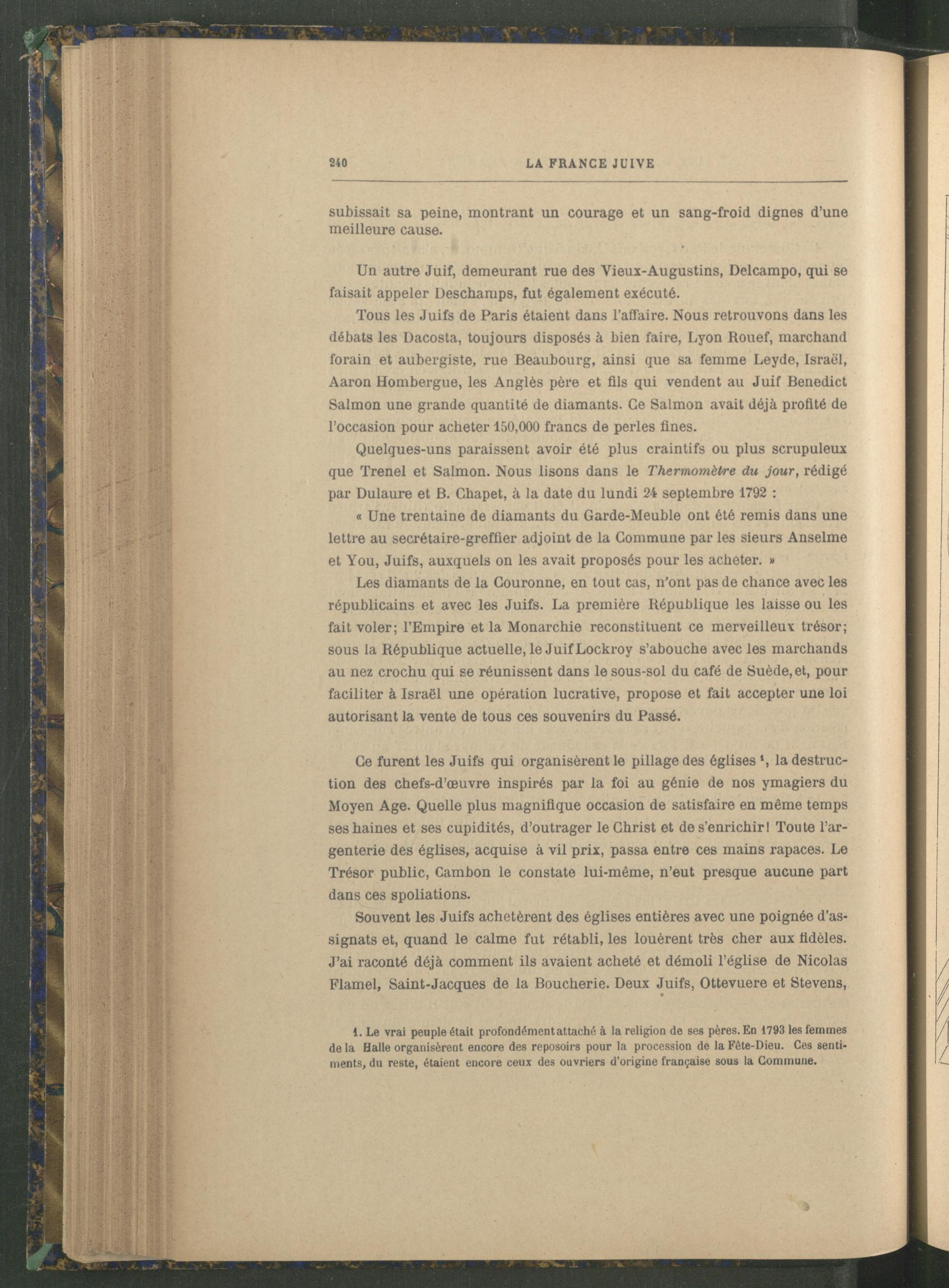 Souvent les Juifs achetèrent des églises entières avec une poignée d’assignats et, quand le calme fut rétabli, les louèrent très cher aux fidèles. J’ai raconté déjà comment ils avaient acheté et démoli l’église de Nicolas Flamel , Saint-Jacques de la Boucherie. Deux Juifs, Ottevuere et Stevens,