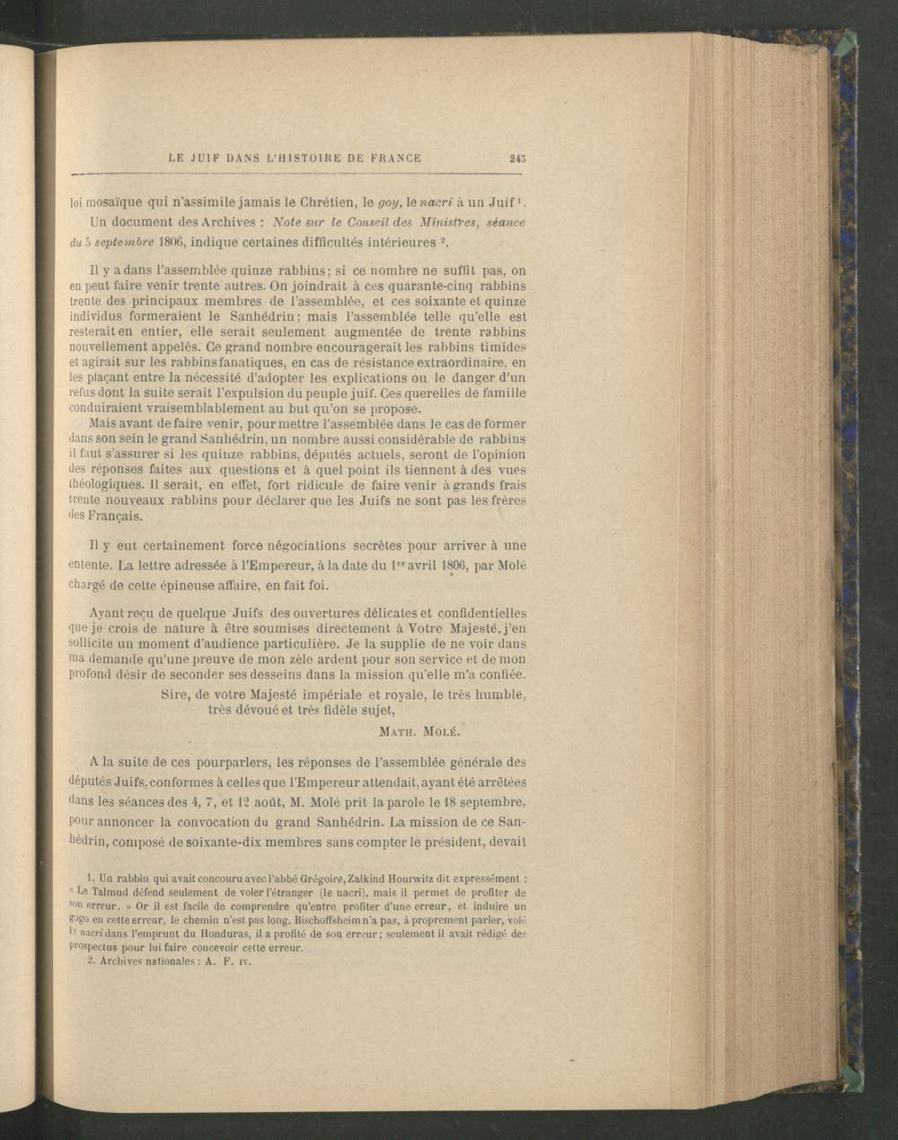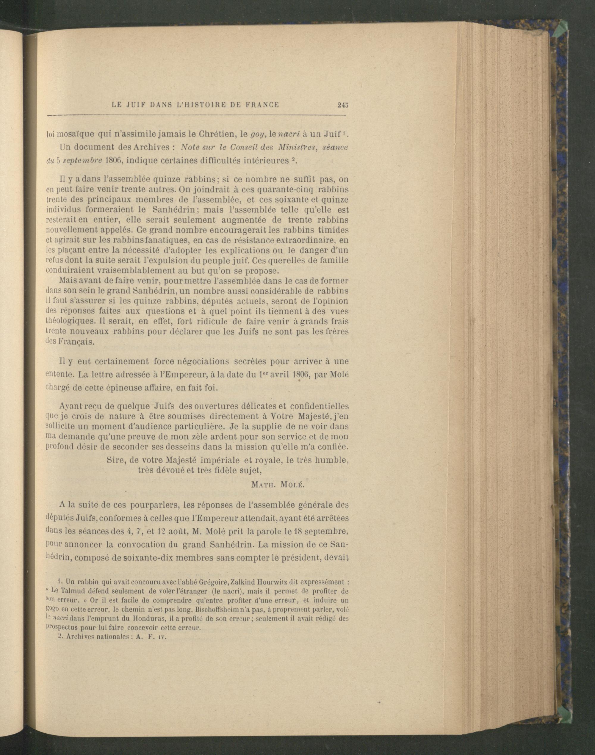 ! A la suite de ces pourparlers, les réponses de l’assemblée générale des députés Juifs , conformes à celles que l’Empereur attendait, ayant été arrêtées dans les séances des 4, 7, et 12 août, M. Molé prit la parole le 18 septembre, pour annoncer la convocation du grand Sanhédrin. La mission de ce Sanhédrin, composé de soixante-dix membres sans compter le président, devait