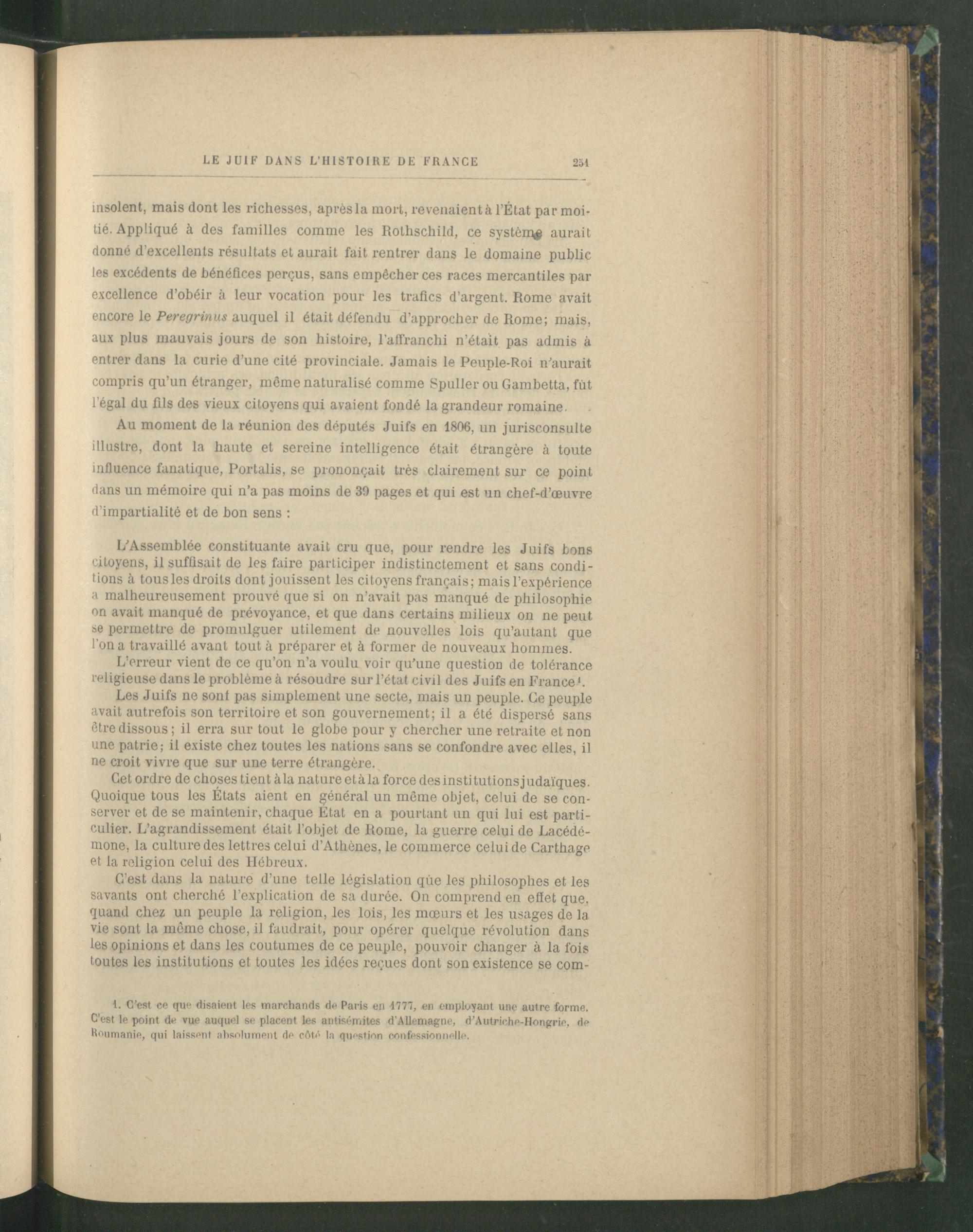 Au moment de la réunion des députés Juifs en 1806, un jurisconsulte illustre, dont la haute et sereine intelligence était étrangère à toute influence fanatique, Portalis , se prononçait très clairement sur ce point dans un mémoire qui n’a pas moins de 30 pages et qui est un chef-d’œuvre d’impartialité et de bon sens ;