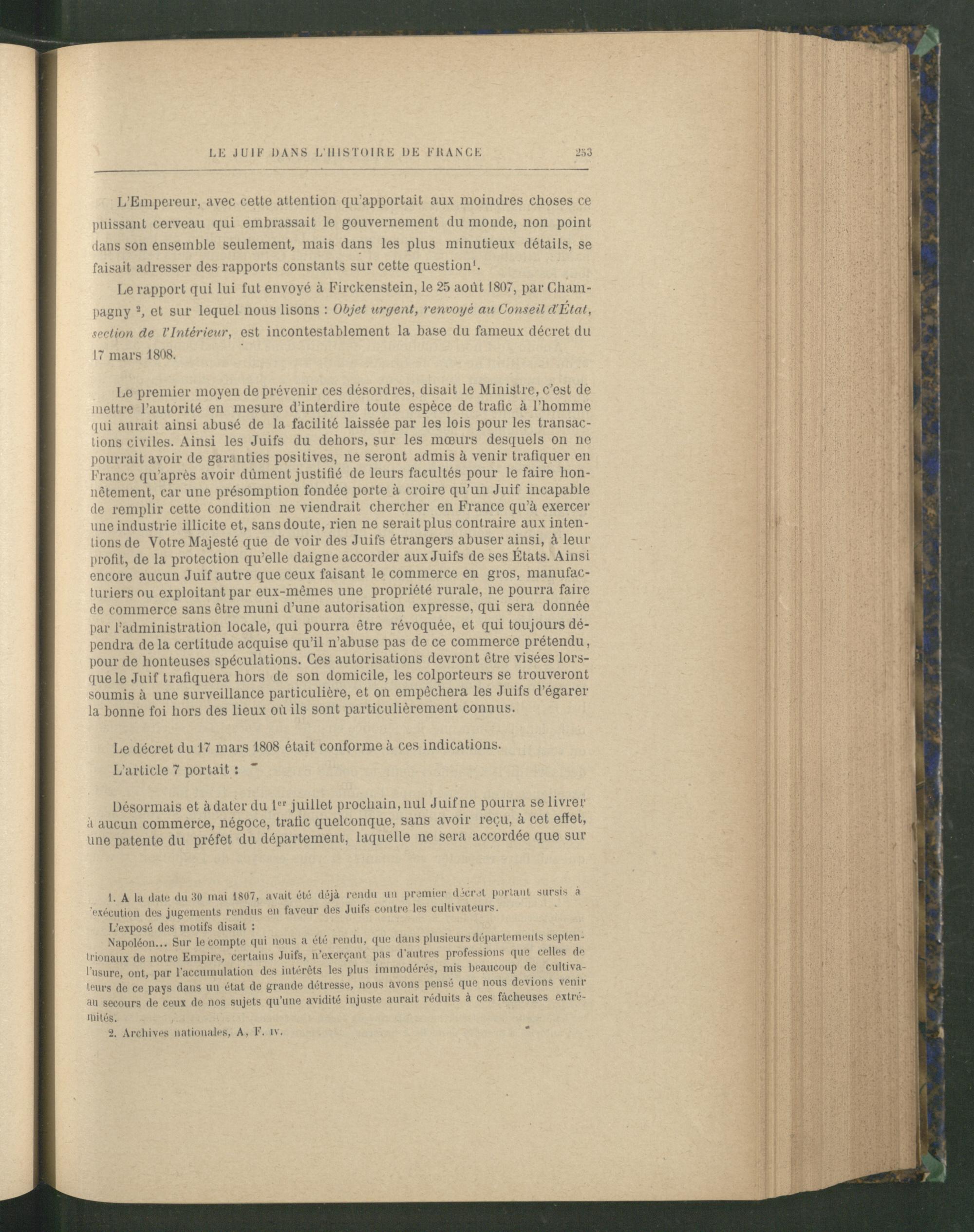 Napoléon ... Sur le compte qui nous a été rendu, que dans plusieursdéparlrmeuls septentrionaux de notre Empire, certains Juifs, n’exerçaut pas d autres professions que celles de I usure, ont, par l'accumulation des intérêts les plus immodérés, rnis beaucoup de cultivateurs de ce pays dans un état de grande détresse, nous avons pensé que nous devions venir ait secours de ceux de nos sujets qu’une avidité injuste aurait réduits à ces fâcheuses extrémités.
