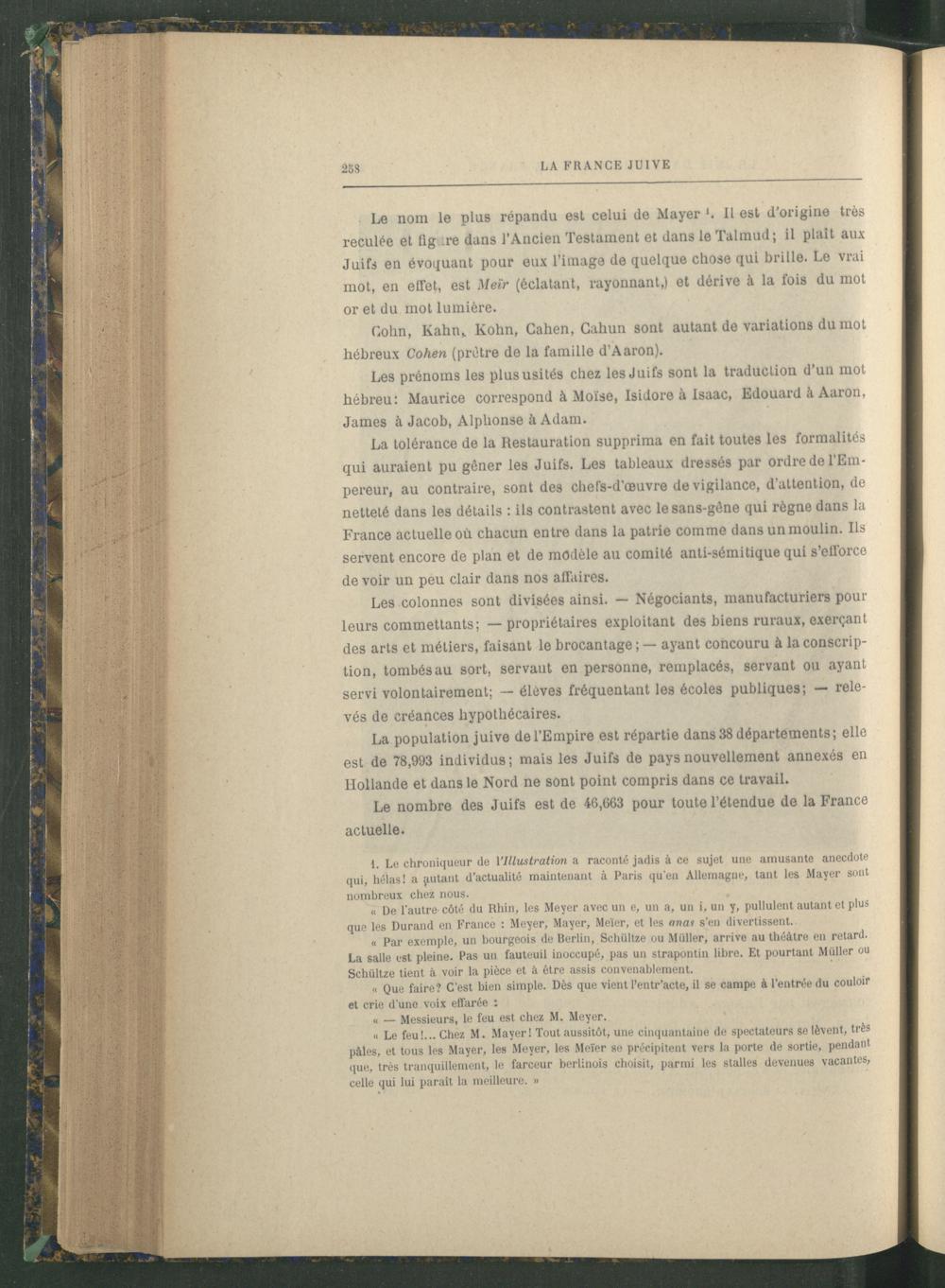 La tolérance de la Restauration supprima en fait toutes les formalités qui auraient pu gêner les Juifs. Les tableaux dressés par ordre de l’Empereur, au contraire, sont des chefs-d'œuvre de vigilance, d’attention, de netteté dans les détails : ils contrastent avec le sans-gêne qui règne dans la France actuelle où chacun entre dans la patrie comme dans un moulin. Ils servent encore de plan et de modèle au comité anti-sémitique qui s’efforce de voir un peu clair dans nos affaires.