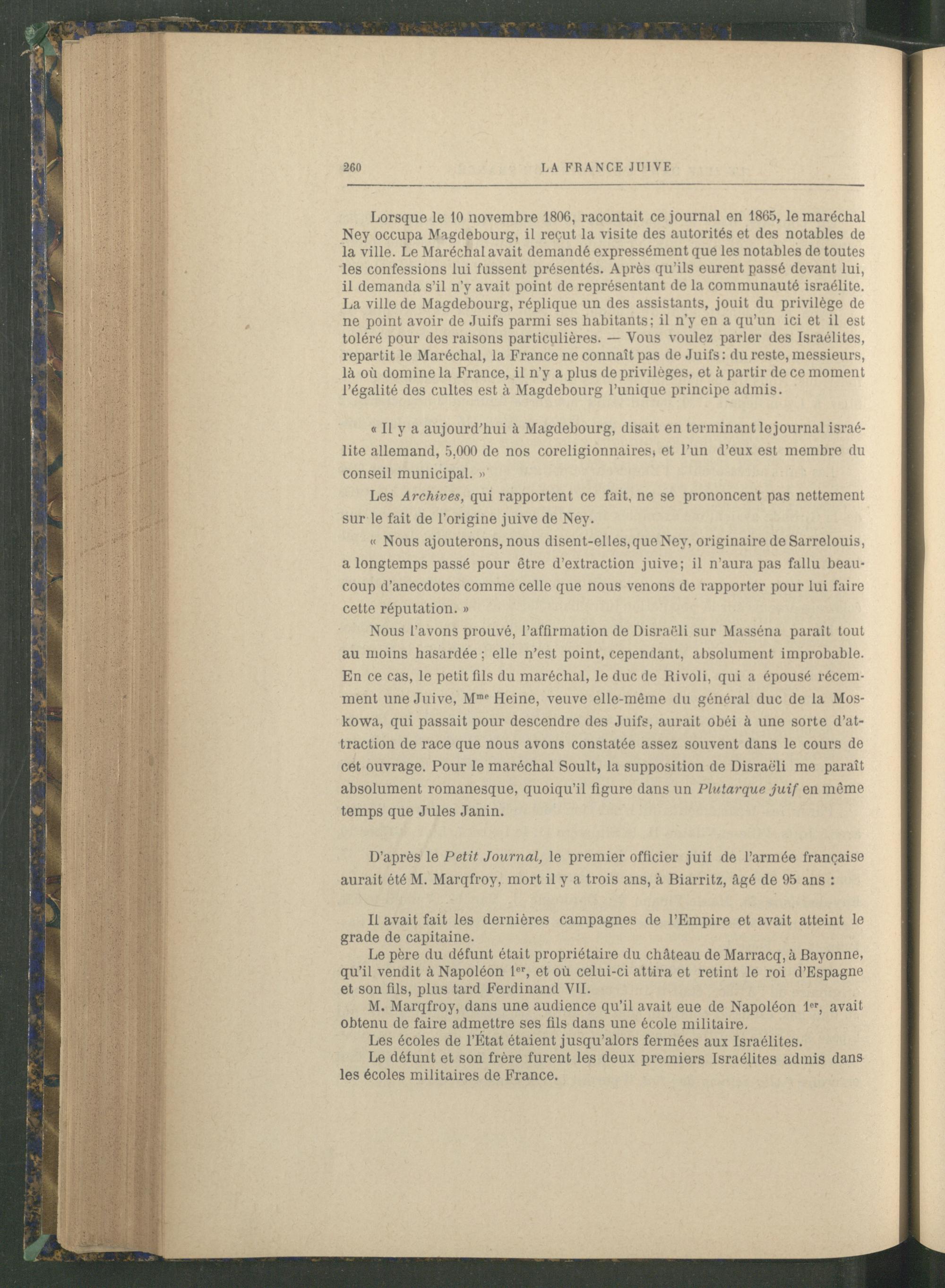 Lorsque le 10 novembre 1806, racontait ce journal en 1865, le maréchal Ney occupa Magdebourg , il reçut la visite des autorités et des notables de la ville. Le Maréchal avait demandé expressément que les notables de toutes les confessions lui fussent présentés. Après qu’ils eurent passé devant lui, il demanda s’il n’y avait point de représentant de la communauté israélite. La ville de Magdebourg , réplique un des assistants, jouit du privilège de ne point avoir de Juifs parmi ses habitants; il n’y en a qu’un ici et il est toléré pour des raisons particulières. — Vous voulez parler des Israélites , repartit le Maréchal, la France ne connaît pas de Juifs: du reste, messieurs, là où domine la France , il n’y a plus de privilèges, et à partir de ce moment l’égalité des cultes est à Magdebourg l’unique principe admis.