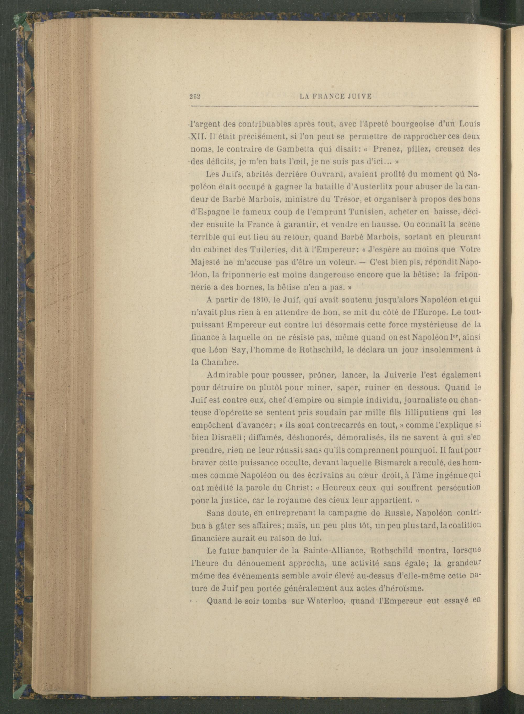Les Juifs, abrités derrière Ouvrant, «avaient profité du moment qü Na poléon était occupé à gagner la bataille d’Austerlitz pour abuser de la candeur de Barbé Marbois , ministre du Trésor, et organiserez propos des bons d'Espagne le lameux coup de l’emprunt Tunisien, acheter en baisse, décider ensuite la France «à garantir, et vendre en hausse. On connaît la scène terrible qui eut lieu au retour, quand Barbé Marbois , sortant en pleurant du cabinet des Tuileries , dit îi l’Empereur: « J'espère au moins que Votre Majesté ne m’accuse pas d’étre un voleur. — C’est bien pis, répondit Napo léon , la friponnerie est moins dangereuse encore que la bêtise: la friponnerie a des bornes, la bêtise n’en a pas. »