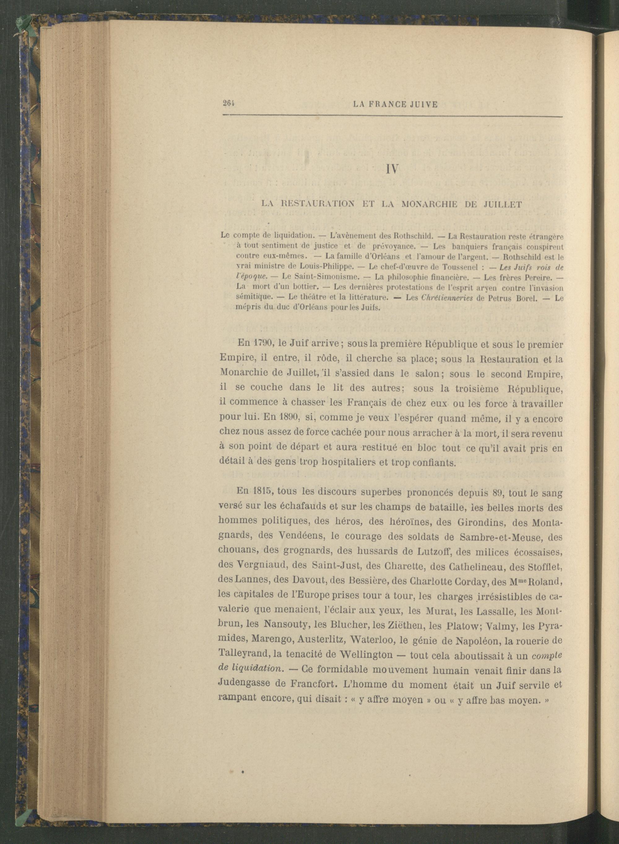 Le compte de liquidation. — L’avènement des Rothschild . — La Restauration reste étrangère à tout sentiment de justice et de prévoyance. — Les banquiers français conspirent contre eux-mêmes. —La famille d’Orléans et l’amour de l’argent. — Rothschild est le vrai ministre de Louis-Philippe . — Le chef-d’œuvre de Toussenel : — Les Juifs rois de l'époque. — Le Saint-Simonisme. — La philosophie financière. — Les frères Pereire. — La mort d’un bottier. — Les dernières protestations de l’esprit aryen contre l’invasion sémitique. — Le théâtre et la littérature. — Les Chrélienneries de Petrus Borel . — Le mépris du duc d'Orléans pour les Juifs.