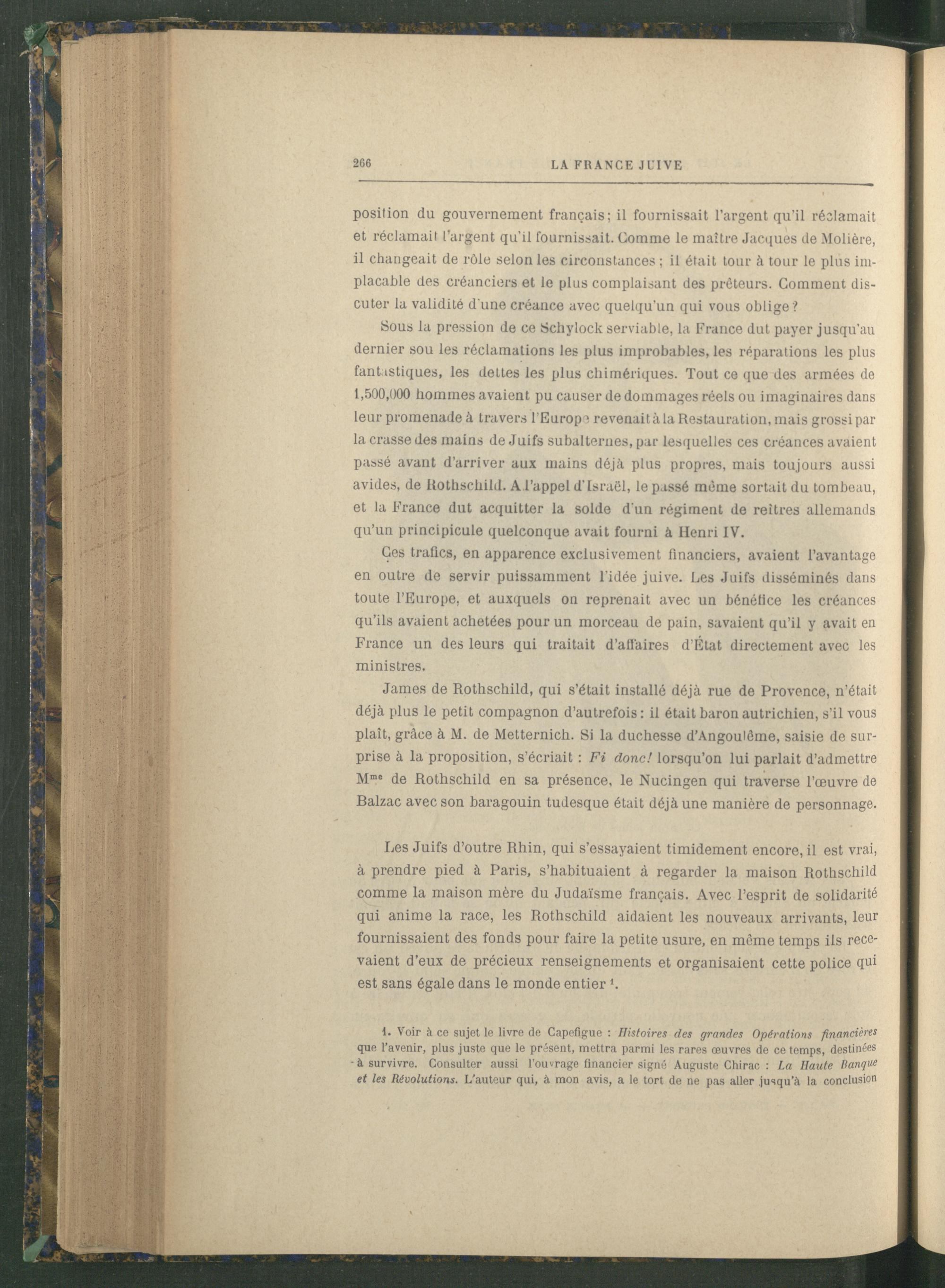 Sous la pression de ce Schylock serviable, la France dut payer jusqu’au dernier sou les réclamations les plus improbables, les réparations les plus fantastiques, les dettes les plus chimériques. Tout ce que des armées de 1,500,000 hommes avaient pu causer dédommagés réels ou imaginaires dans leur promenade à travers l’Europe revenaitàla Restauration, mais grossi par la crasse des mains de Juifs subalternes, par lesquelles ces créances avaient passé avant d’arriver aux mains déjà plus propres, mais toujours aussi avides, de Rothschild . A l’appel d’Israël , le passé même sortait du tombeau, et la France dut acquitter la solde d'un régiment de reitres allemands qu’un principicule quelconque avait fourni à Henri IV .